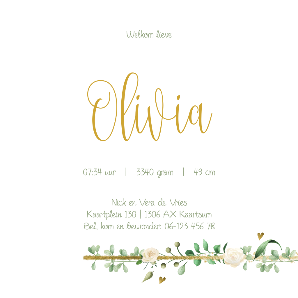 Wat een stijlvolle geboortekaart van LOVZ! Dit vierkante kaartje is versierd met een elegante takjes met witte bloemen en een los takje bij de naam. Hoe heet jouw dochter? Maak hem compleet met eigen teksten en een envelop!