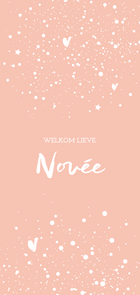 Lief geboortekaartje voor een klein meisje met peach achtergrond met daarop een sterrenhemel van stippen, sterren en hartjes. Rondom zit een witte kader.