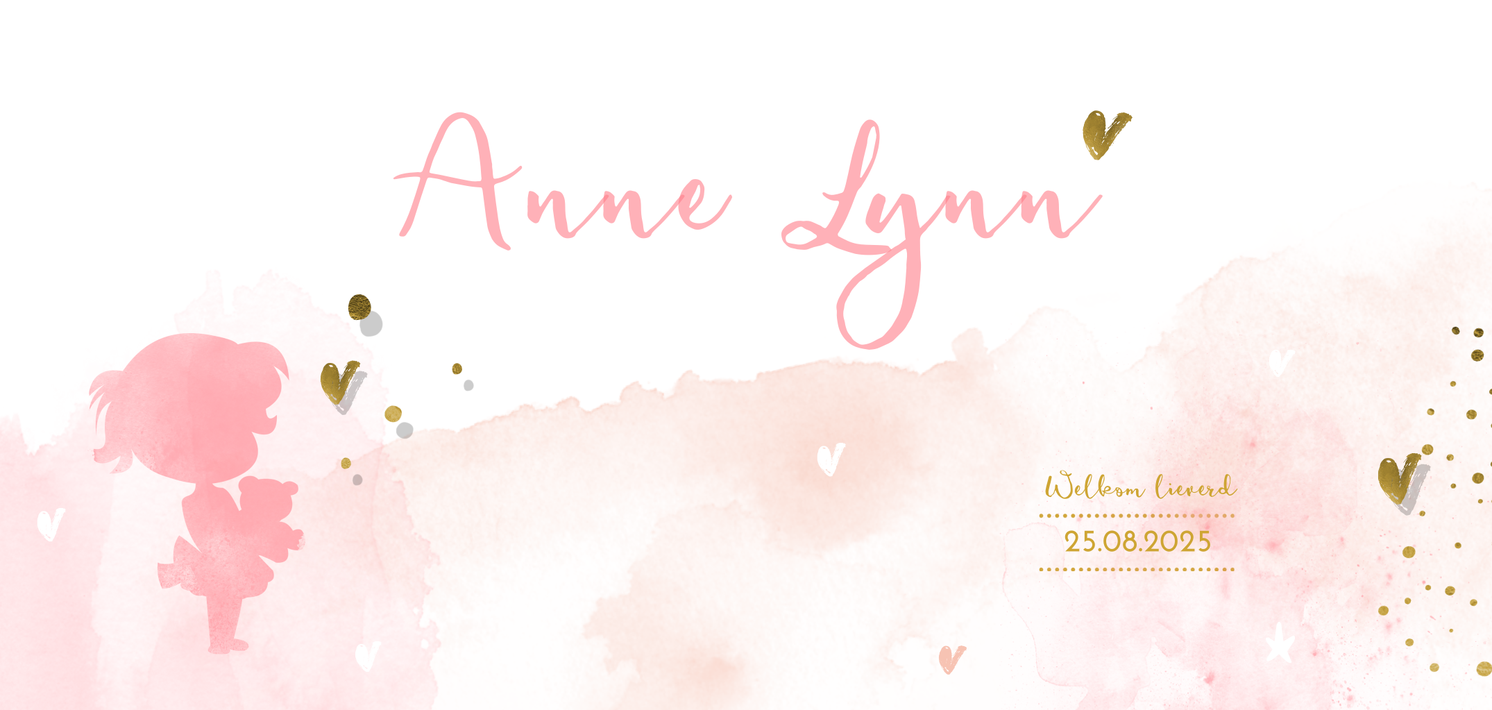 De roze watercolour in combinatie met hartjes en stippen in wit en goudlook maken dit een hip geboortekaartje! Speciaal is het roze silhouet van een meisje met knuffel op de voorkant.