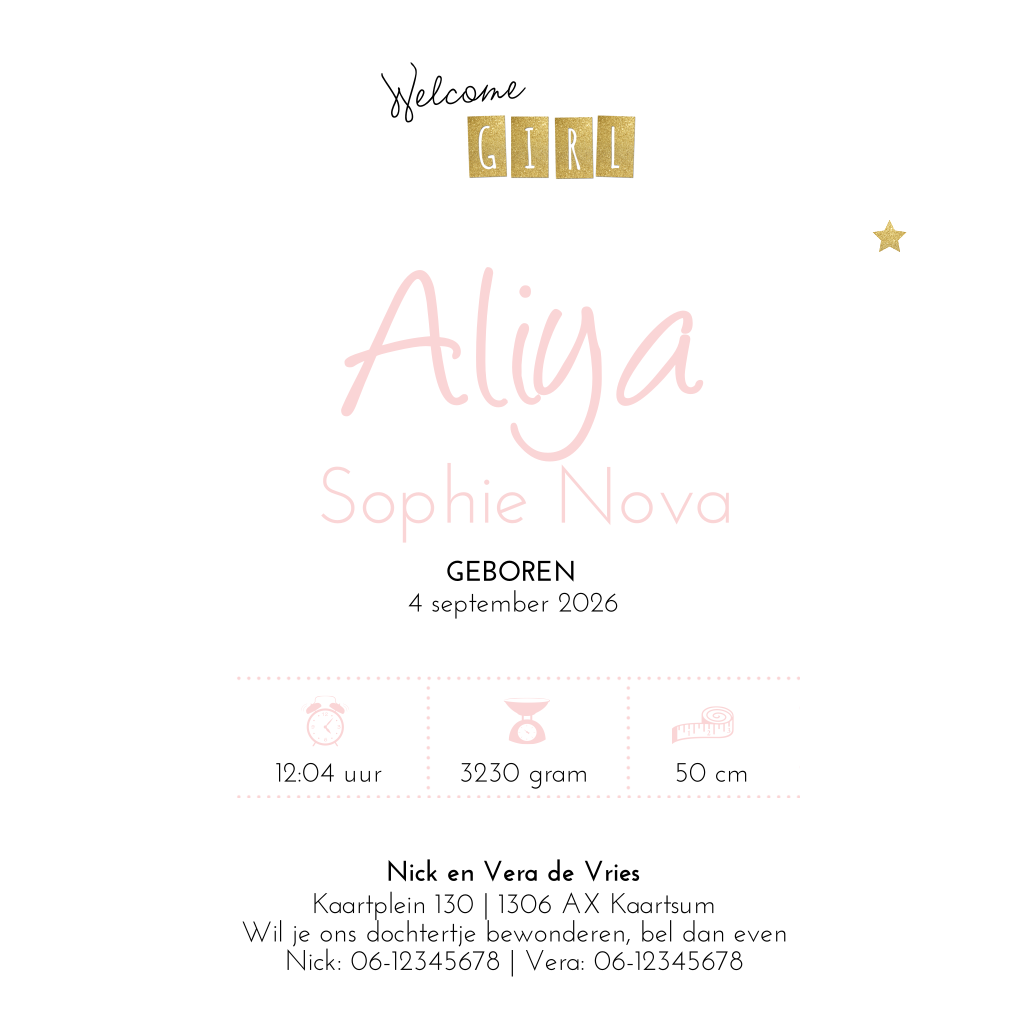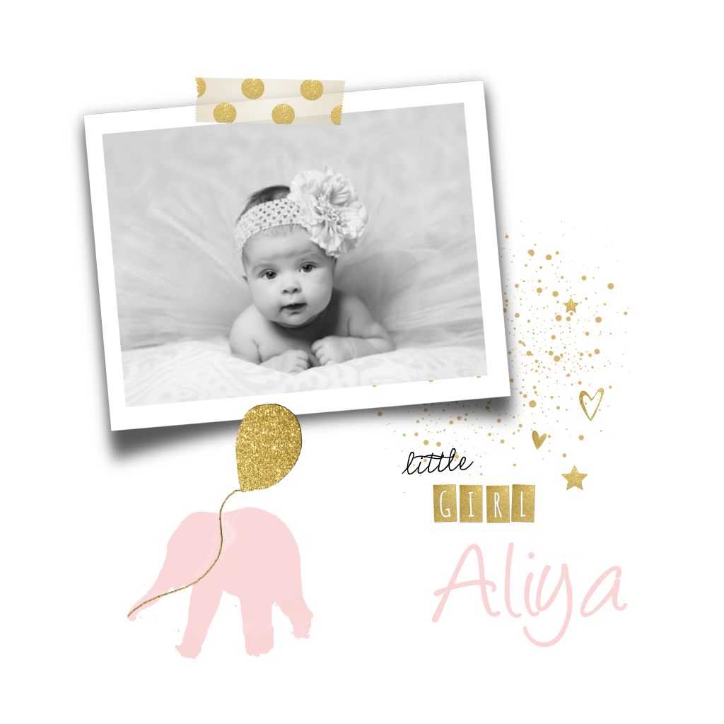 Hip foto geboortekaartje voor een meisje met olifanten familie in de kleuren en wit en zachtroze! Met speelse elementjes in goudlook zoals ballon, hartjes en sterren. Alles staat los en is te verplaatsen!