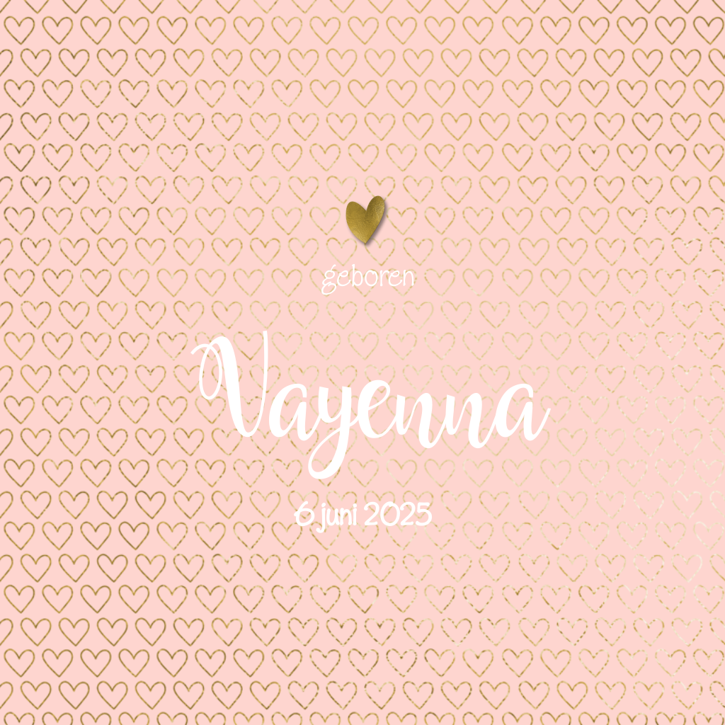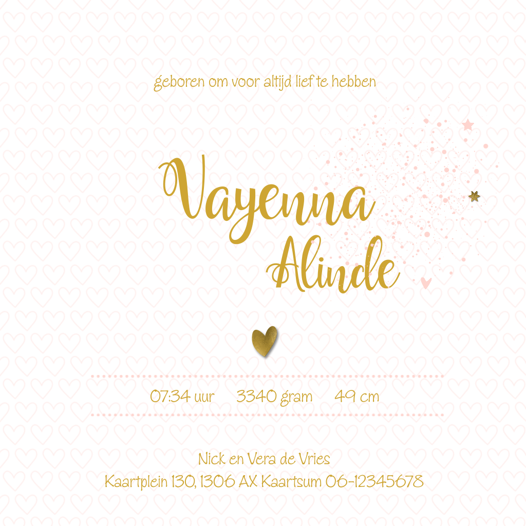 Stoer en romantisch geboortekaartje voor een meisje met hartjes in goudlook en trendy typografie. In de binnenkant van de kaart staan verfspatten en watercolour.