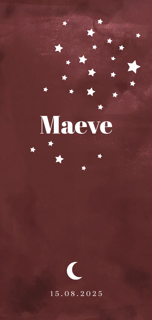 Wat een stoer geboortekaartje. Dit geboortekaartje heeft een bordeauxrode structuurachtergrond. De naam, sterren en maantje is gedrukt in goudfolie en laat het kaartje echt schitteren. Het kaartje heeft een langwerpig staand formaat en is volledig naar wens aan te passen in onze online editor.
