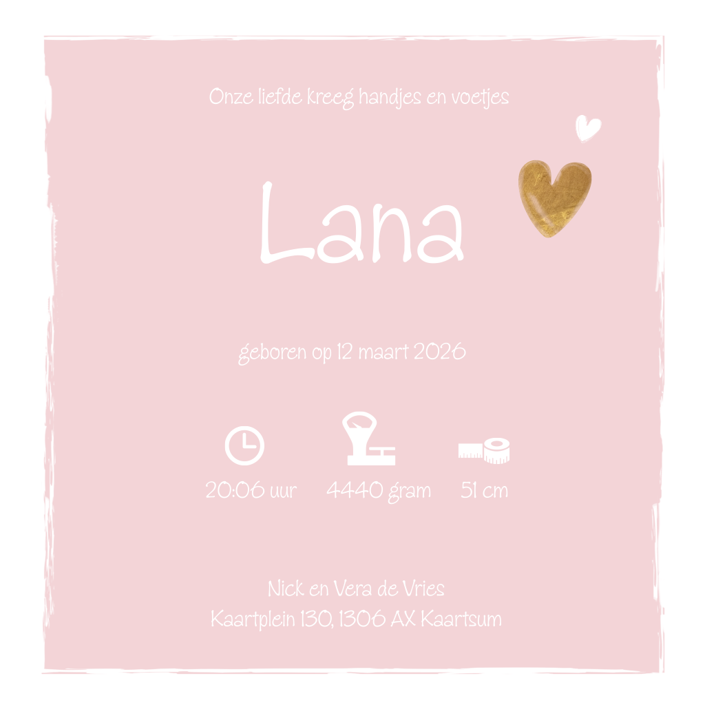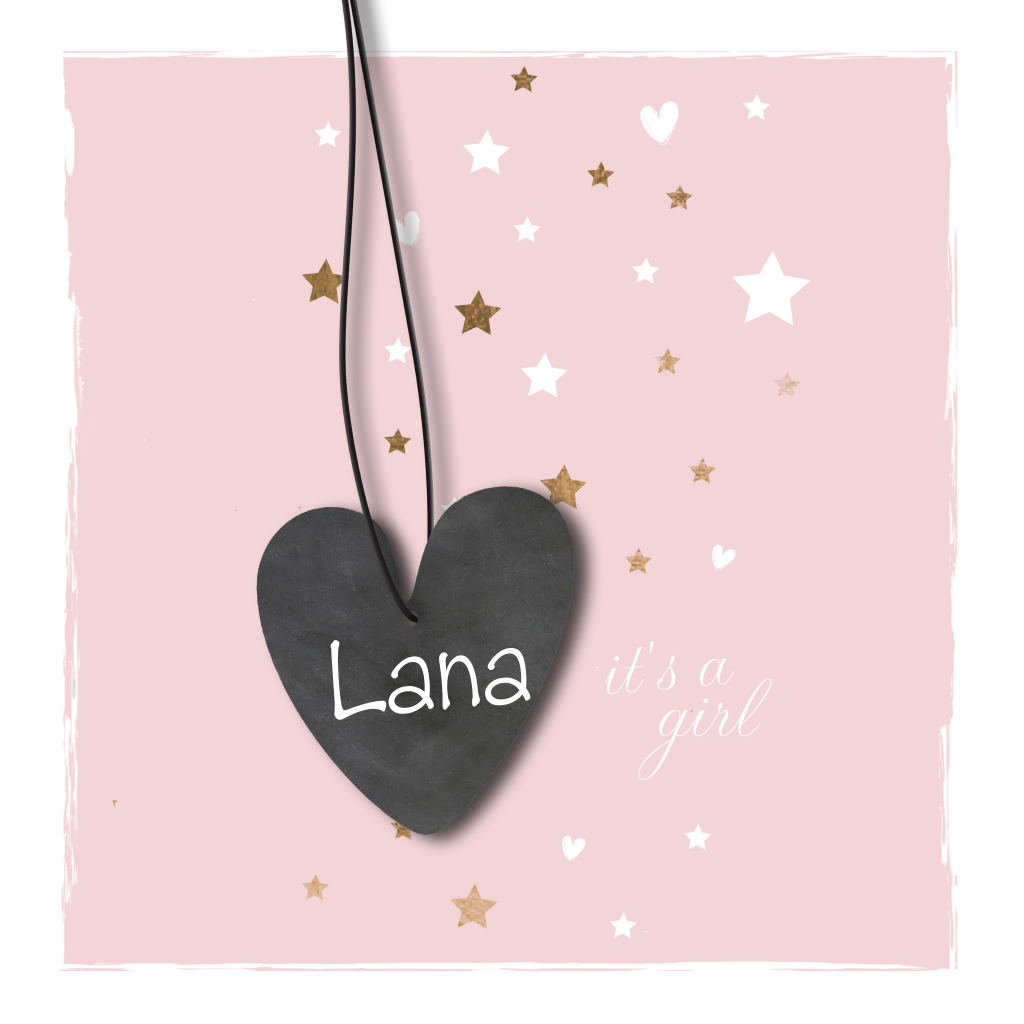 Super lief geboortekaartje met een hartjeshanger in trendy krijtbord stijl. Met hartjes en sterretjes in koper.