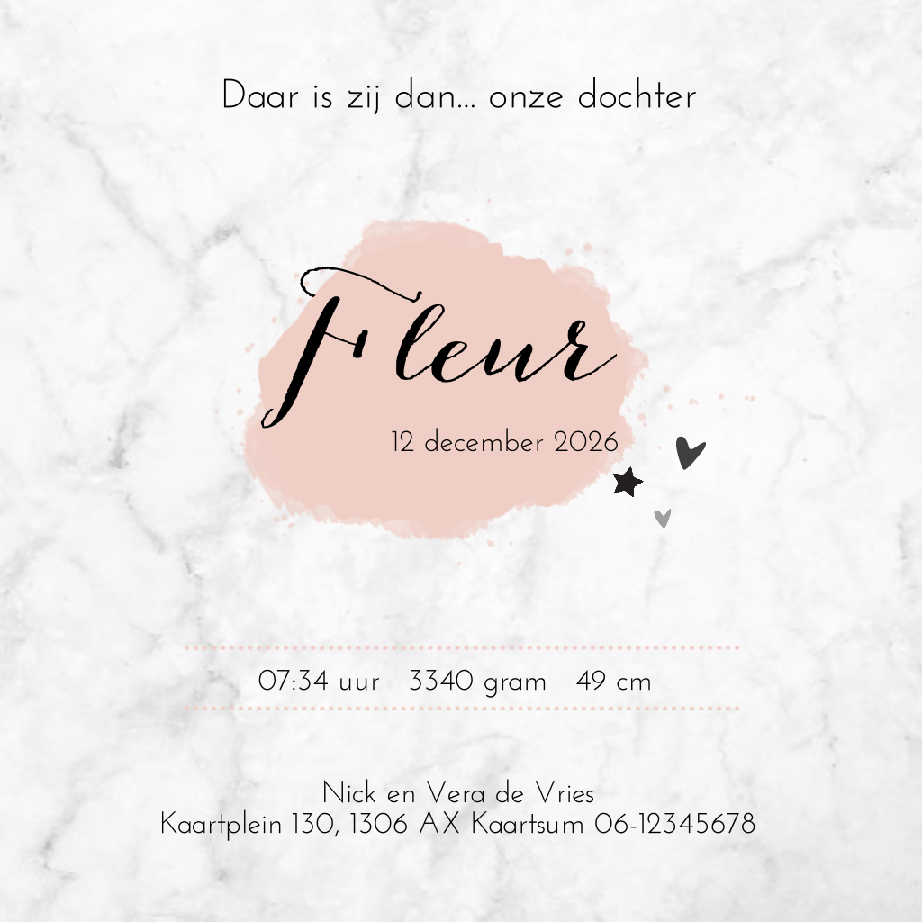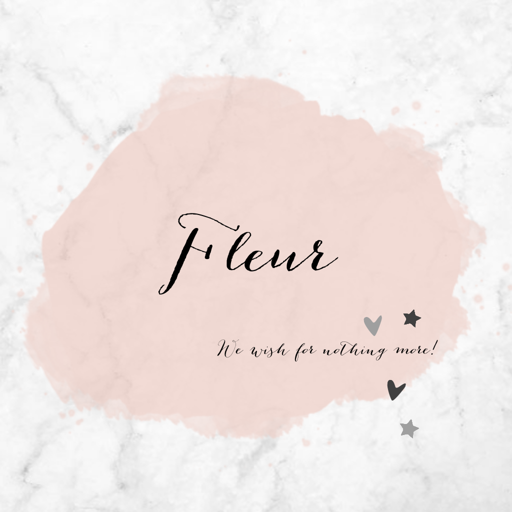 Marmer is de nieuwe trend voor geboortekaartjes. Lief door de zachtroze waterverf. Alle teksten van dit kaartje hebben een handlettering look.