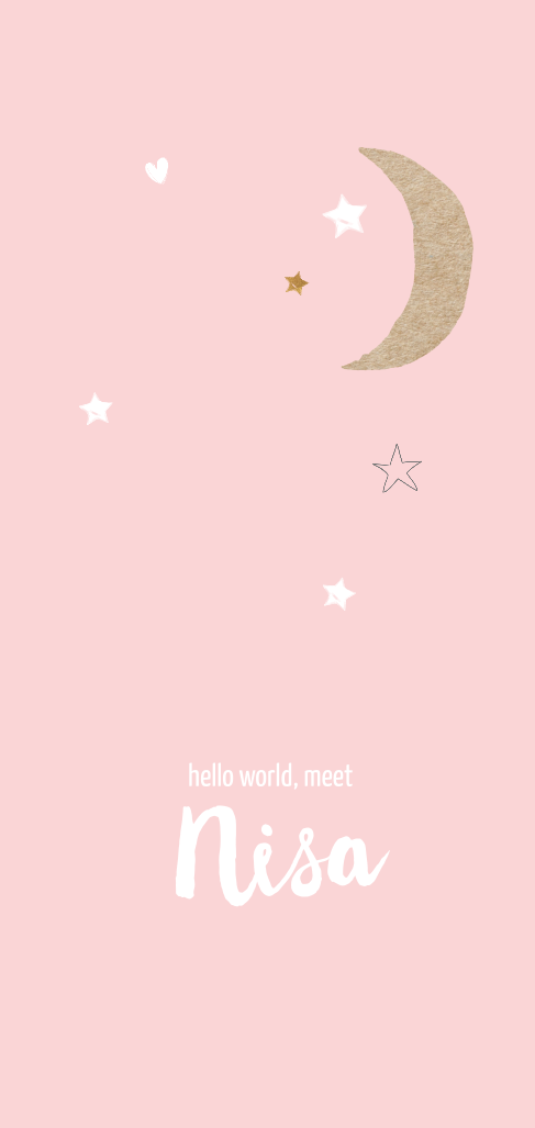 Een lief langwerpig geboortekaartje voor een meisje. Met hippe elementjes zoals een kraft maan, lieve hartjes en sterren met een koperlook. In een modern roze tint die ook aangepast kan worden! Extra lang formaat 10x21cm.