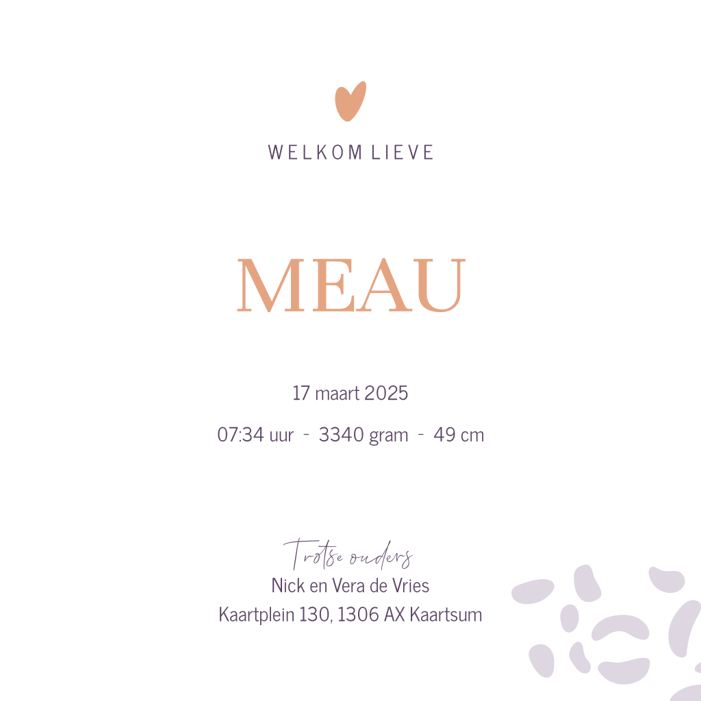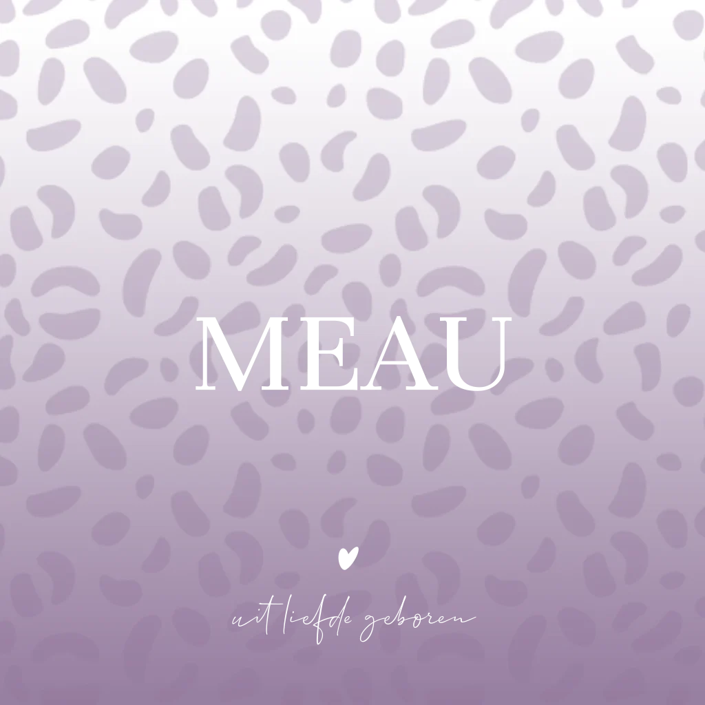 Een vrolijk en hip geboortekaartje met paarse panterprint. De naam en details zijn gedrukt in roségoudfolie en geeft het kaartje echt een luxe uitstraling. Bestel een proefdruk om dit kaartje in het echt te bewonderen.