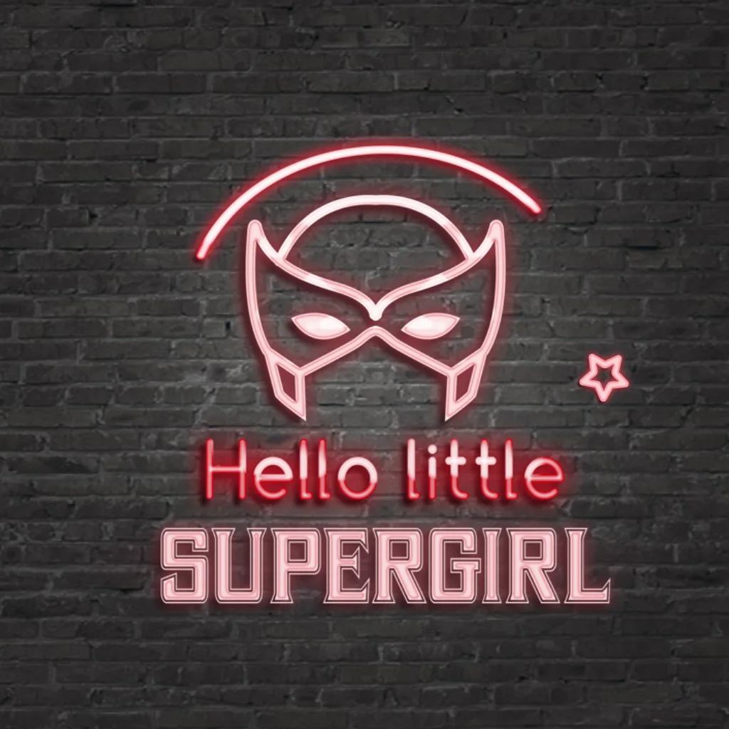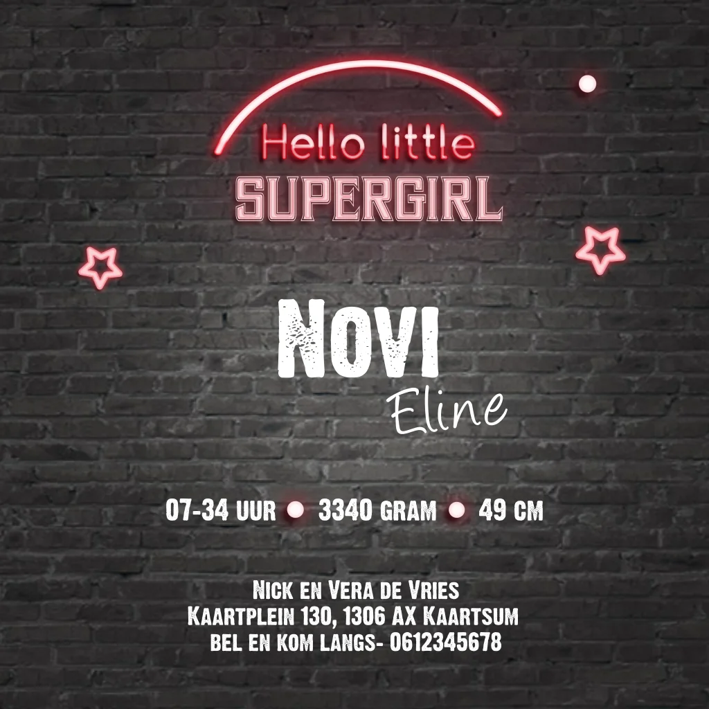 Uniek geboortekaartje met reclame lichtbox effect voor een meisje. Met een donkergrijze stenen muur op de ondergrond met neon sign supergirl masker in het roze. Alles is te bewerken!