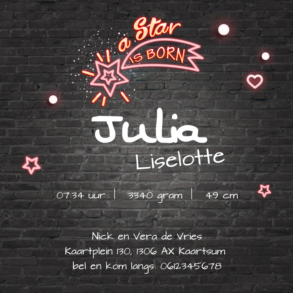 Super leuk babykaartje voor een meisje met licht box gekleurd effect. Met sterren, hartjes en dots in roze / oranje. Alles staat los op dit geboortekaartje!