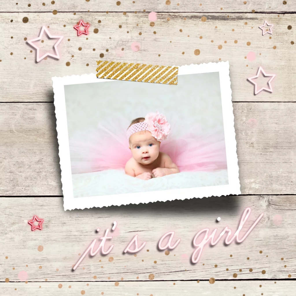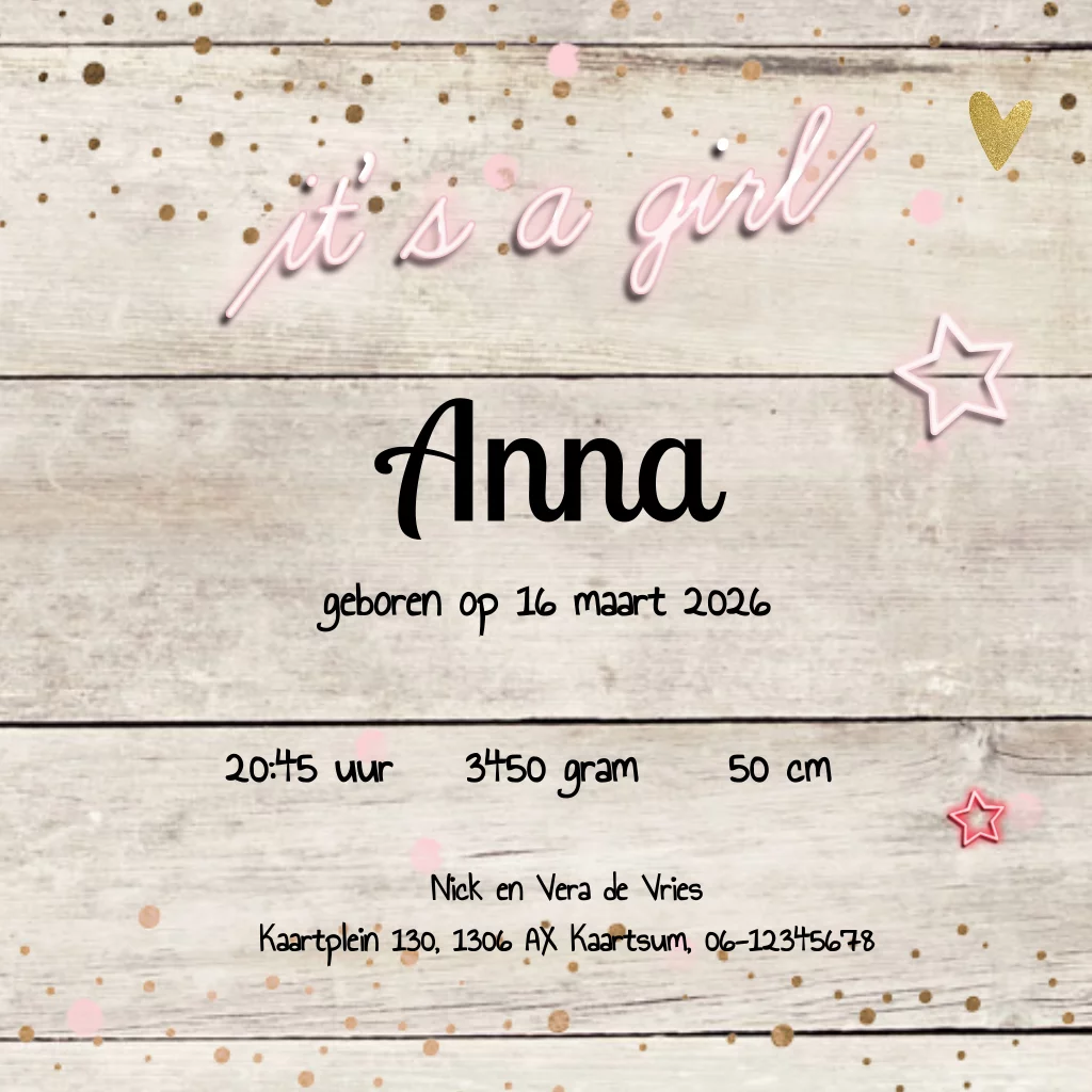 Lief foto geboortekaartje voor een meisje met houtprint op de ondergrond. Met neon effect sterren en tekst it's a girl, fotokader, glitter ster en plakband elementjes en confetti.