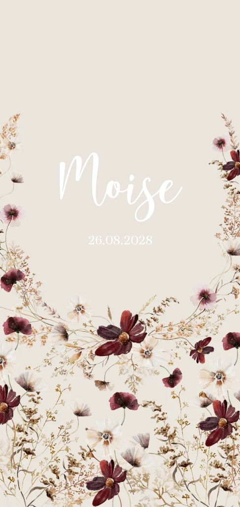 Een langwerpig geboortekaartje voor jouw meisje. Het kaartje heeft zachte ronde hoeken met beige achtergrond. De naam is gedrukt in goudfolie. Aan de onderkant van het kaartje zie je prachtige donkerrode bloemen en takjes. Pas het ontwerp naar wens aan in onze online editor.