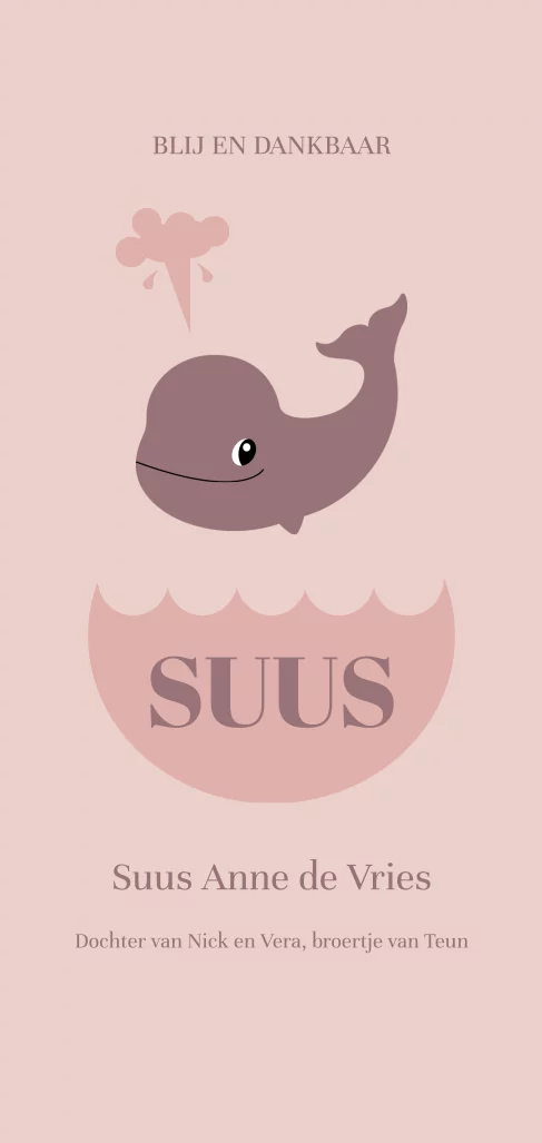 Een lief geboortekaartje voor jouw meisje. Het kaartje heeft een langwerpig formaat met ronde hoeken. Op het kaartje zie je een illustratie van een walvis. De achtergrond heeft een roze kleur.