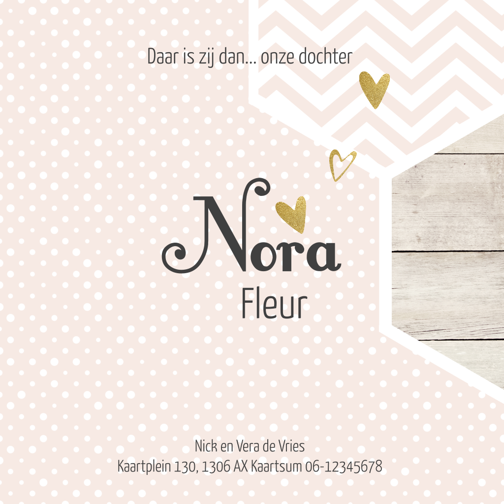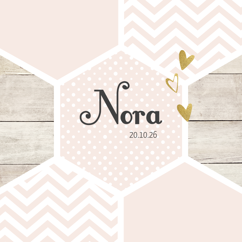Trendy geboortekaartje met honingraat patroon, chevron patroon, stippen, houtprint en koperkleurige hartjes voor een meisje.