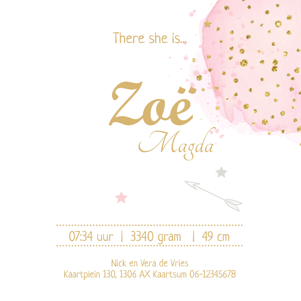 Hip geboortekaartje voor een meisje met roze watercolour, goudlook, grafische confetti glitters, sterren en pijltjes. Maak dit geboortekaartje helemaal zoals jij het zelf wilt!