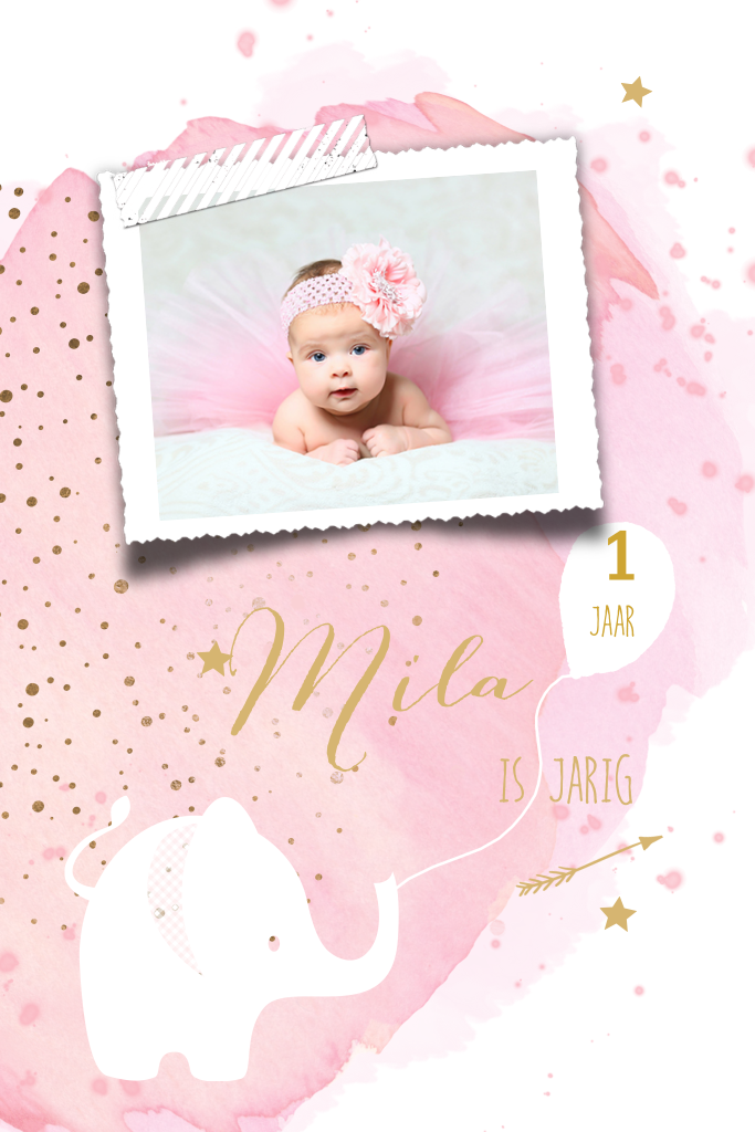 Een wolk van roze watercolour en een lief, wit olifantje met een enorme wolk van stipjes en sterren in goudlook; wat een magisch verjaardagskaartje! Ook leuk is dat je een eigen foto in het fotolijstje kunt plaatsen. Voor de allereerste verjaardag van een meisje!