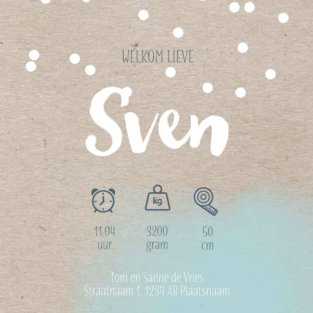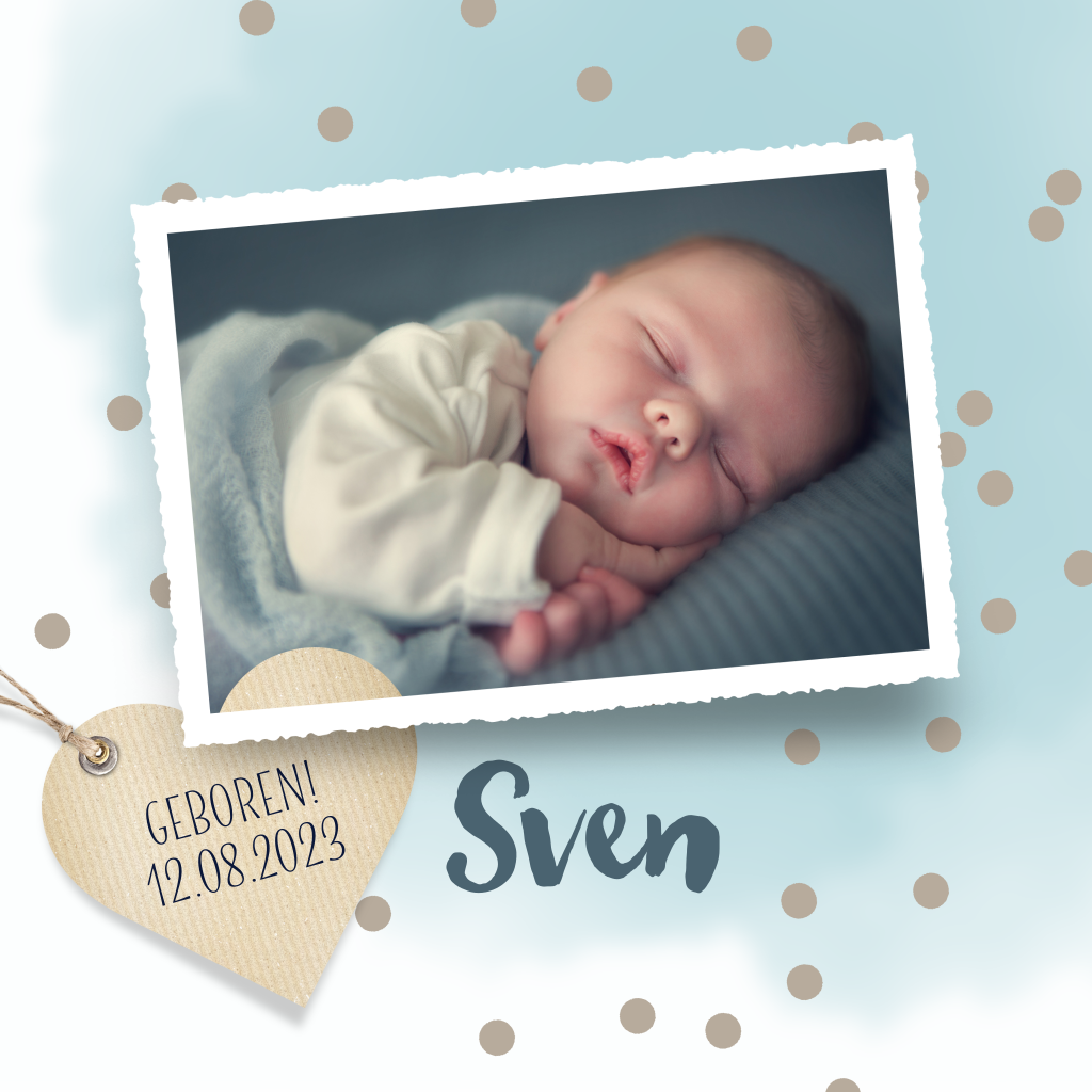 Hip geboortekaartje met aquarel achtergrond, polaroid en stippen. Plaats je eigen foto in het kader. Pas kleuren en lettertypen naar wens aan in de editor.