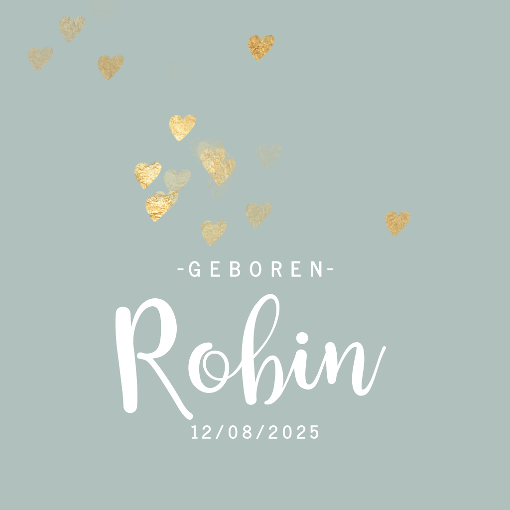 Trendy babykaartje met goudkleurige hartjes op een mintgroene achtergrond. Pas de teksten en kleuren op dit kaartje eenvoudig aan in de online editor.