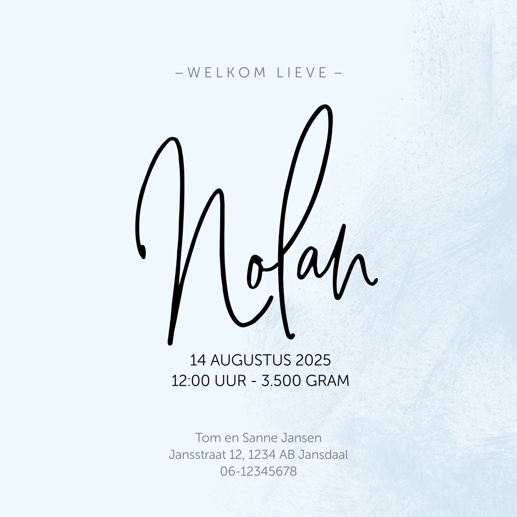 Stoer geboortekaartje voor de geboorteaankondiging van je zoontje met zacht blauwe aquarelverf strepen die een hip structuur vormen. Verander de kleuren en schrijf een persoonlijke tekst en verstuur dit geboortekaartje!