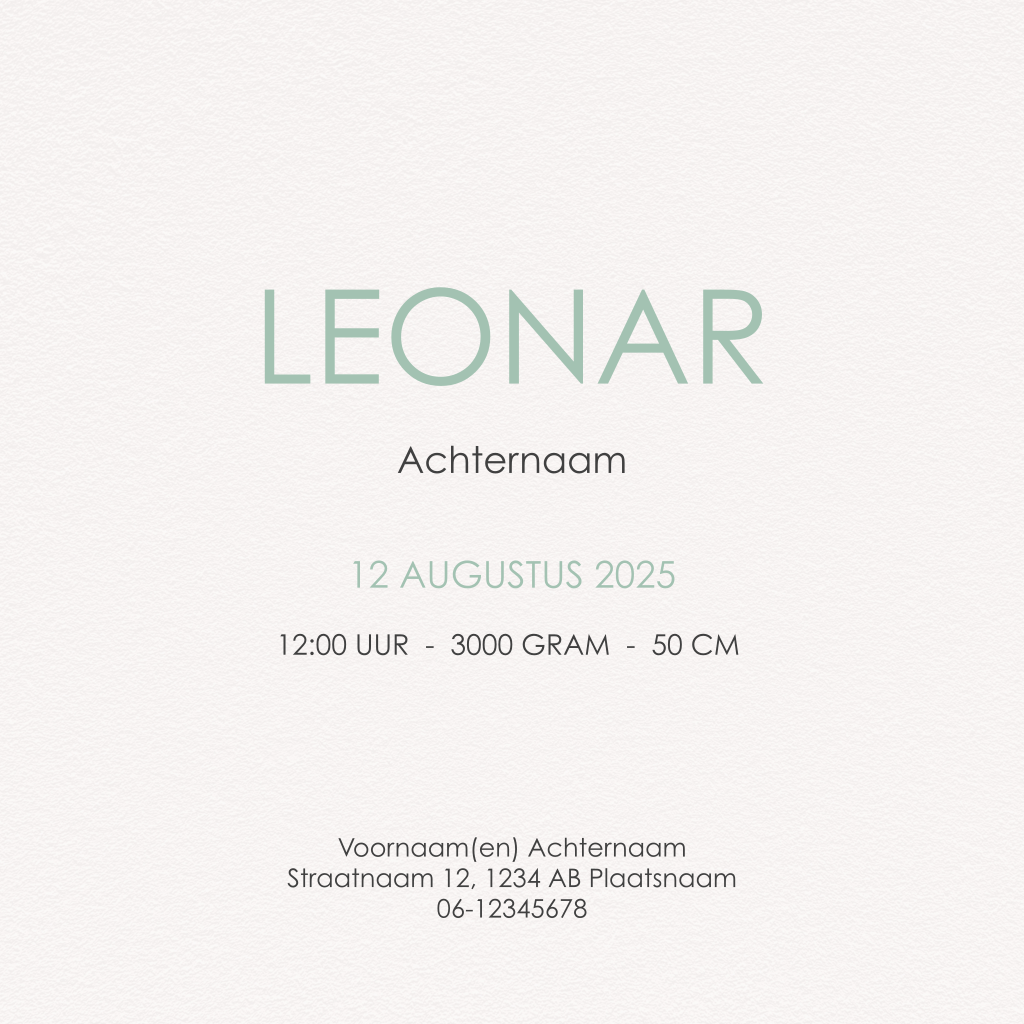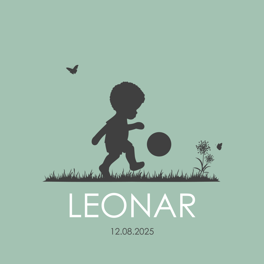 Een speels geboortekaartje van een jongen die speelt met een voetbal. Het jongetje wordt weergegeven als silhouetje in de natuur. De achtergrond van het kaartje heeft een groene kleur. Pas in onze online editor dit kaartje volledig naar wens aan.