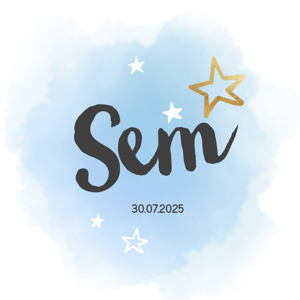 Hip geboortekaartje met handgeschreven lettertype, ster in goudlook en aquarel achtergrond. Pas kleuren en lettertypen makkelijk aan in de editor om de kaart helemaal naar wens te maken!