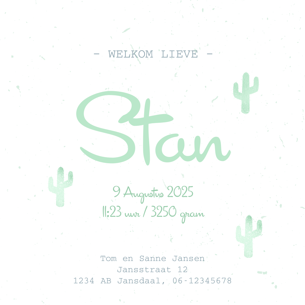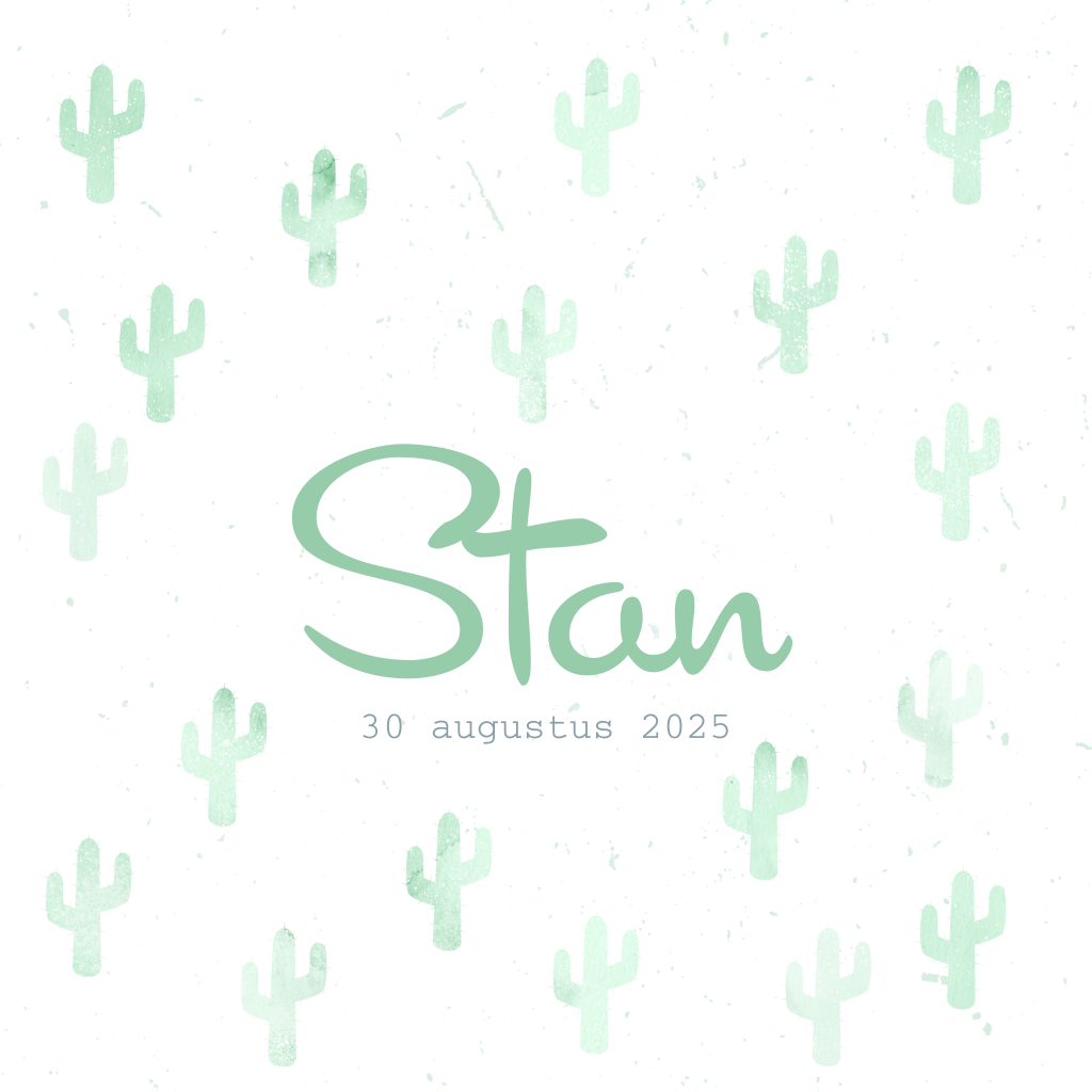 Geboortekaart voor een jongen met stempels van een cactus in het mintgroen. Super hip! Maak er een persoonlijk kaartje van en kijk naar de mogelijkheden in onze online editor. Een eerste proefdruk bestel je al voor €1! Snelle verzending.