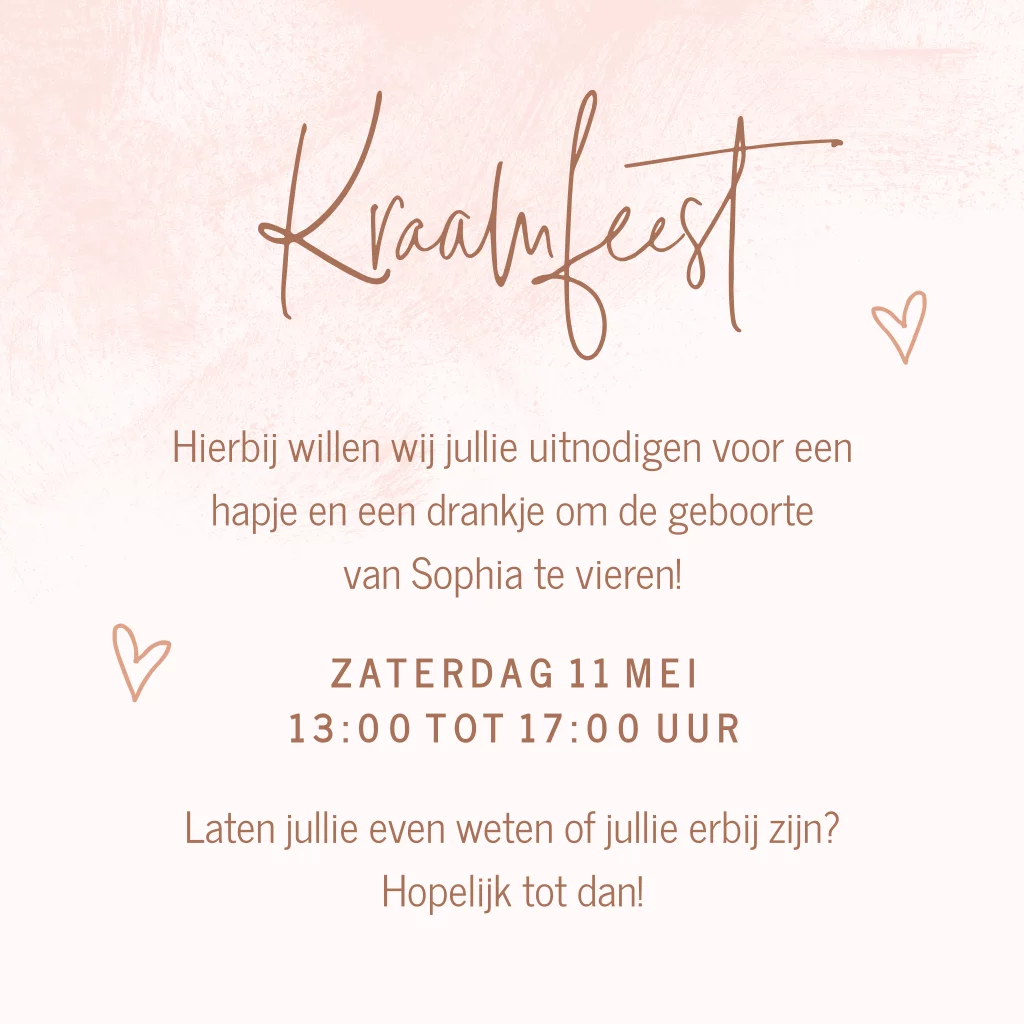 Hippe uitnodigingskaart voor het kraamfeest van een dochtertje. Op de achtergrond van roze waterverf staat de tekst in trendy letters, de twee hartjes maken het af, superlief!