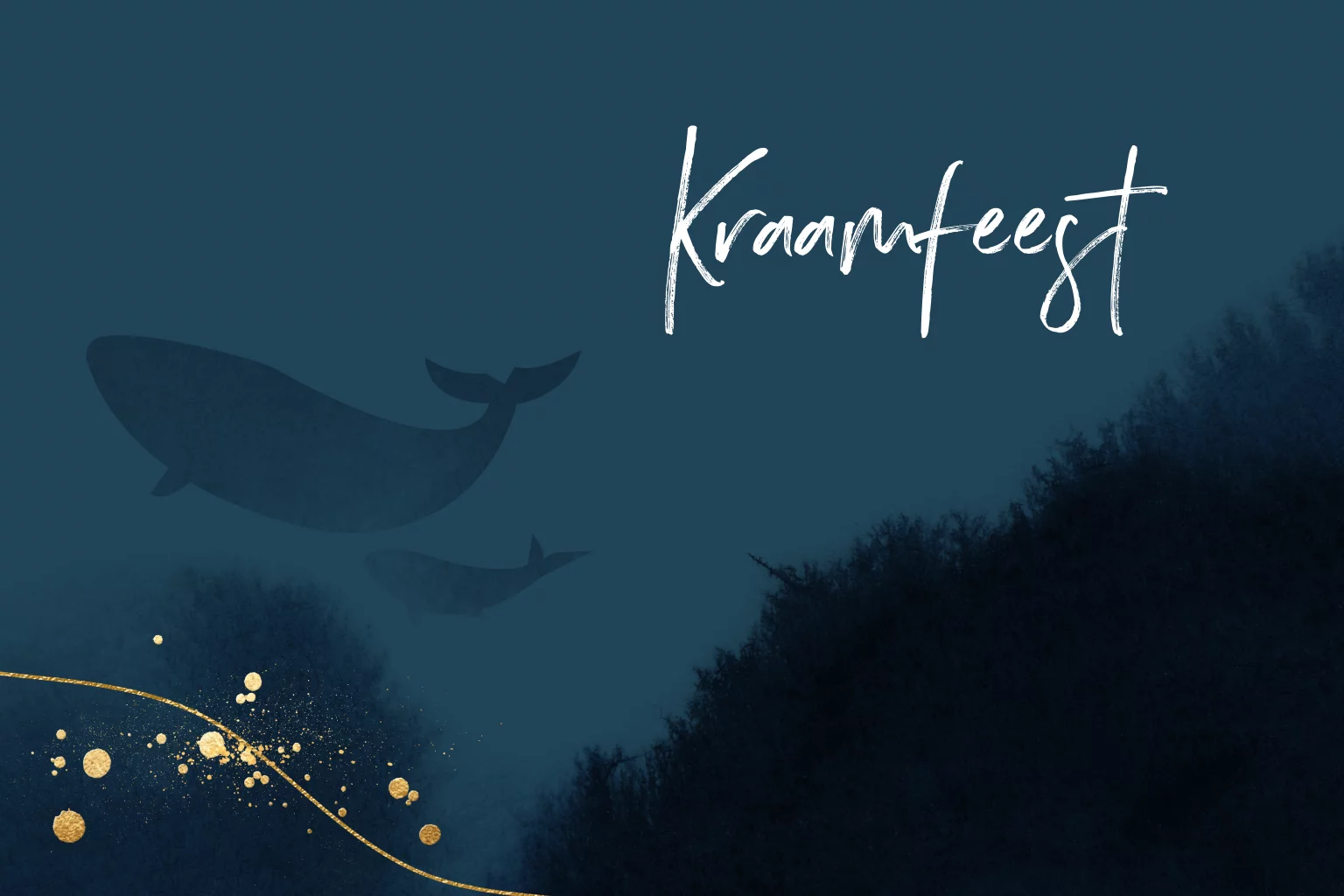 Een stoere kraamborrel uitnodiging om de geboorte van je zoon aan te kondigen. Het kaartje heeft een donkerblauwe basis met daarop goudlook details zoals een hartje en verf spetters. Ook zie je twee walvissen. Pas het ontwerp naar wens aan in onze online editor.