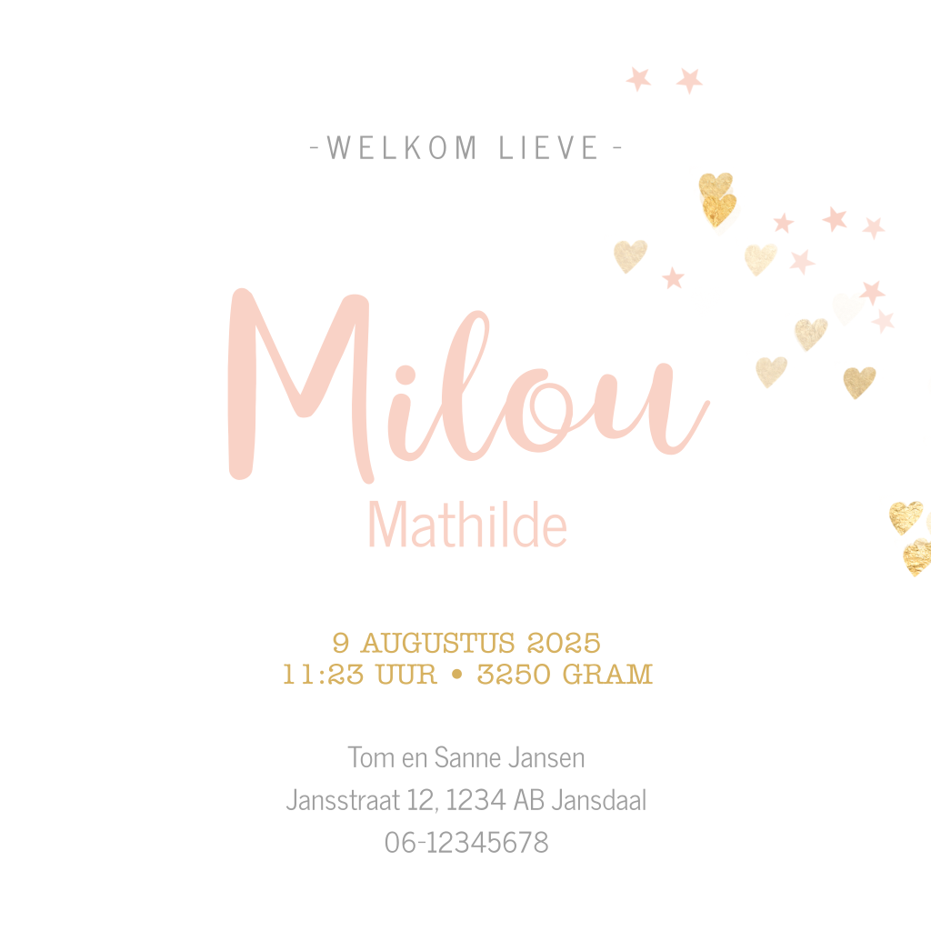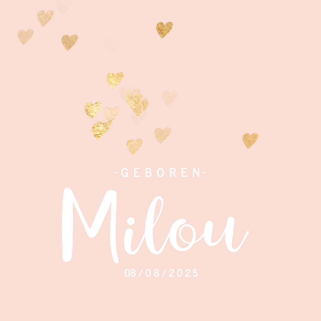 Romantisch geboortekaartje meisje met hartjes in goudlook