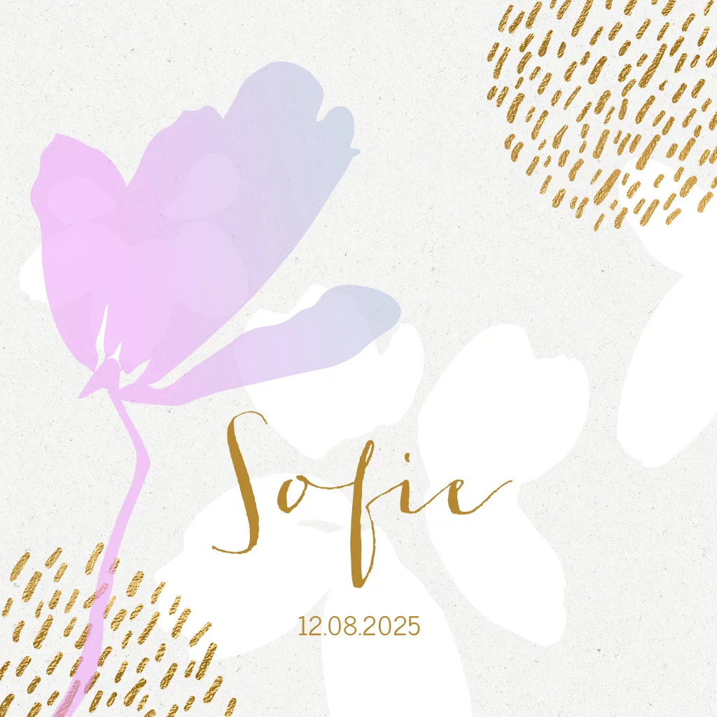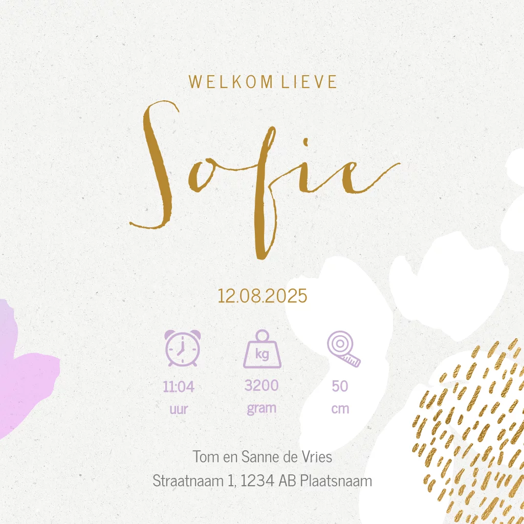 Elegant geboortekaartje voor de geboorte van je kleine meid met stijlvolle bloemen en goudlook streepjes op een achtergrond met de look van karton.
