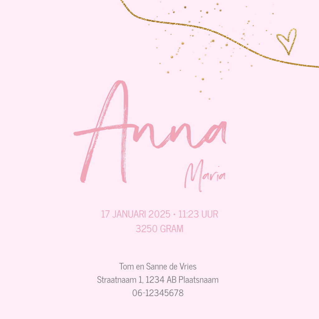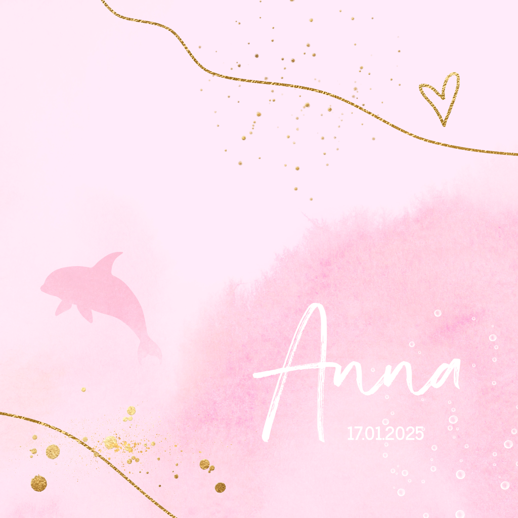 Hip en schattig geboortekaartje voor je pasgeboren dochter met zacht roze aquarelverf en goudlook details zoals een hartje. Het roze waterverf silhouet van een lieve dolfijn maakt dit waterdieren geboortekaartje helemaal af!