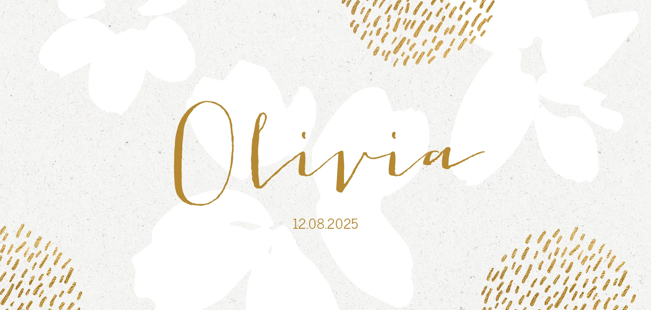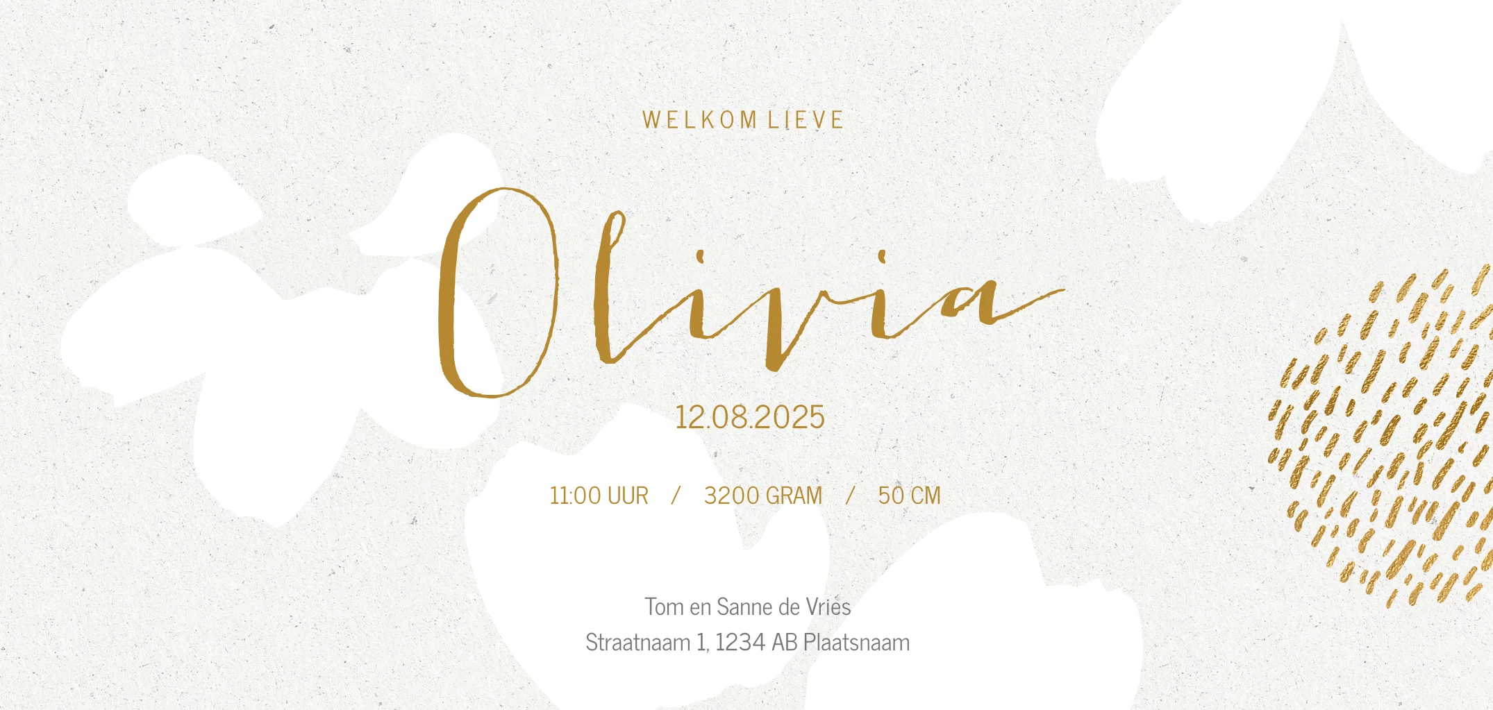 Natuurlijk geboortekaartje voor je dochtertje met witte bloemen en goudlook stipjes patroon op een achtergrond met de look van natuurlijk karton.