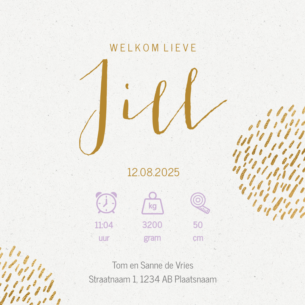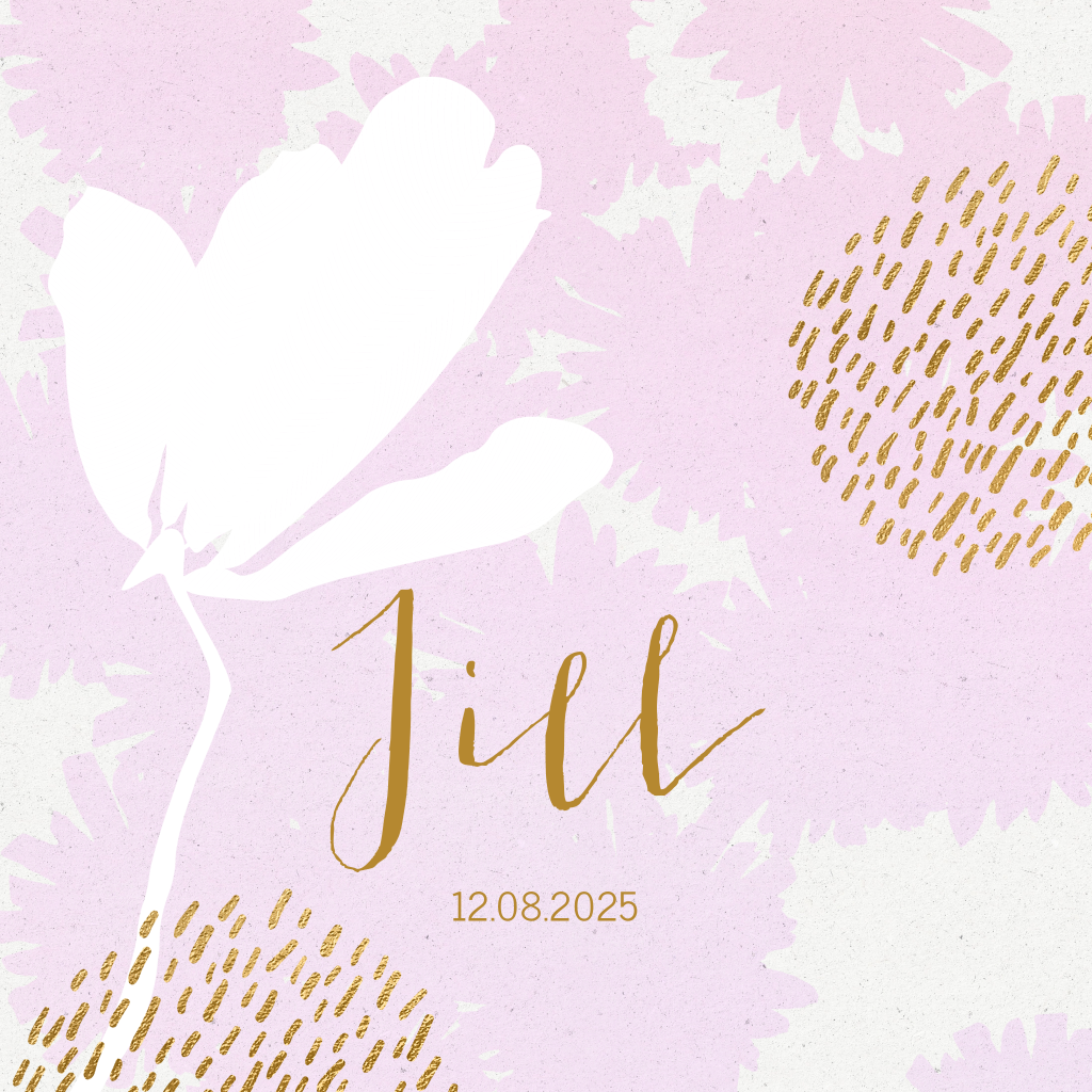 Stijlvol geboortekaartje voor de geboorte van je dochter met een silhouet van wit bloemetje op roze aquarel en goudlook stipjes.