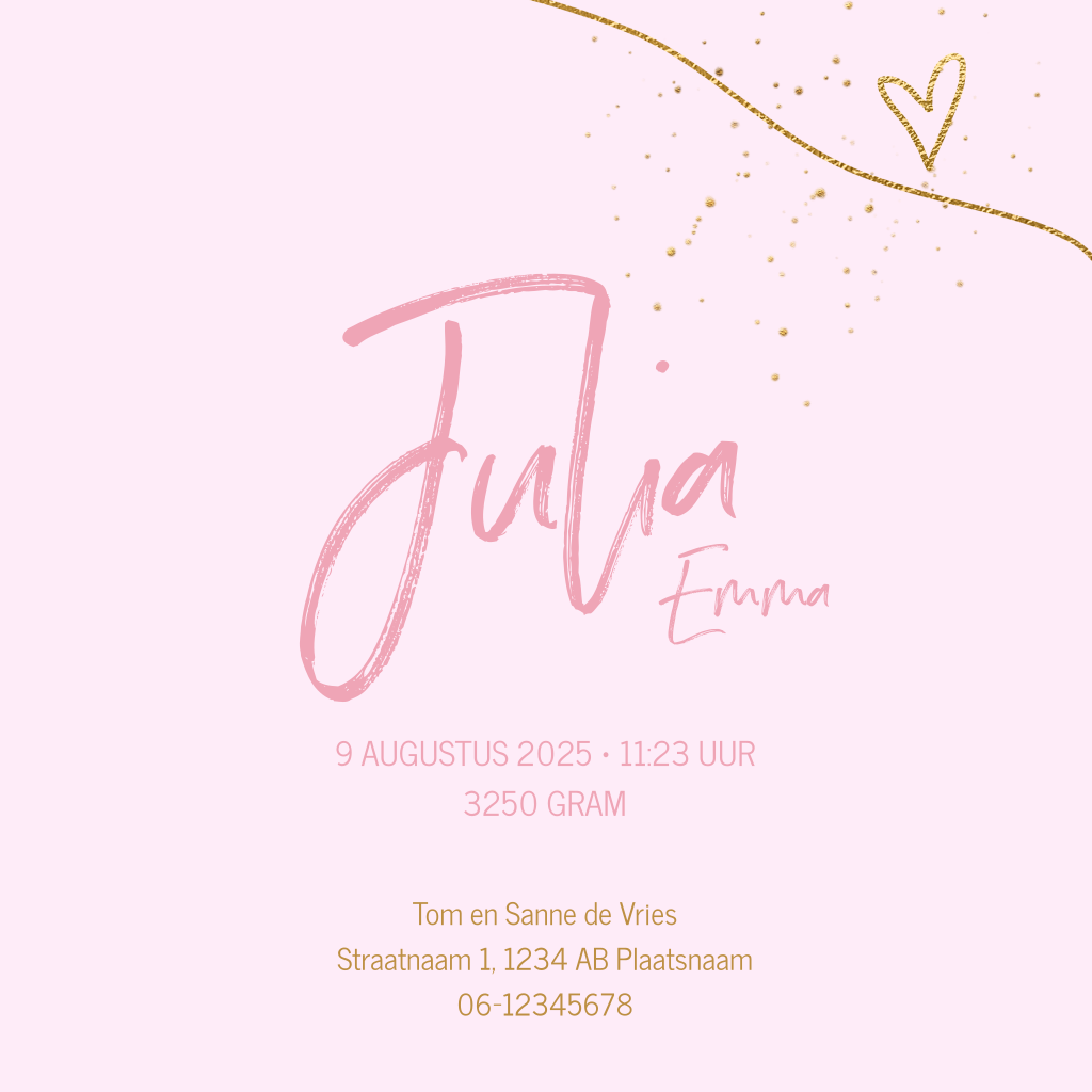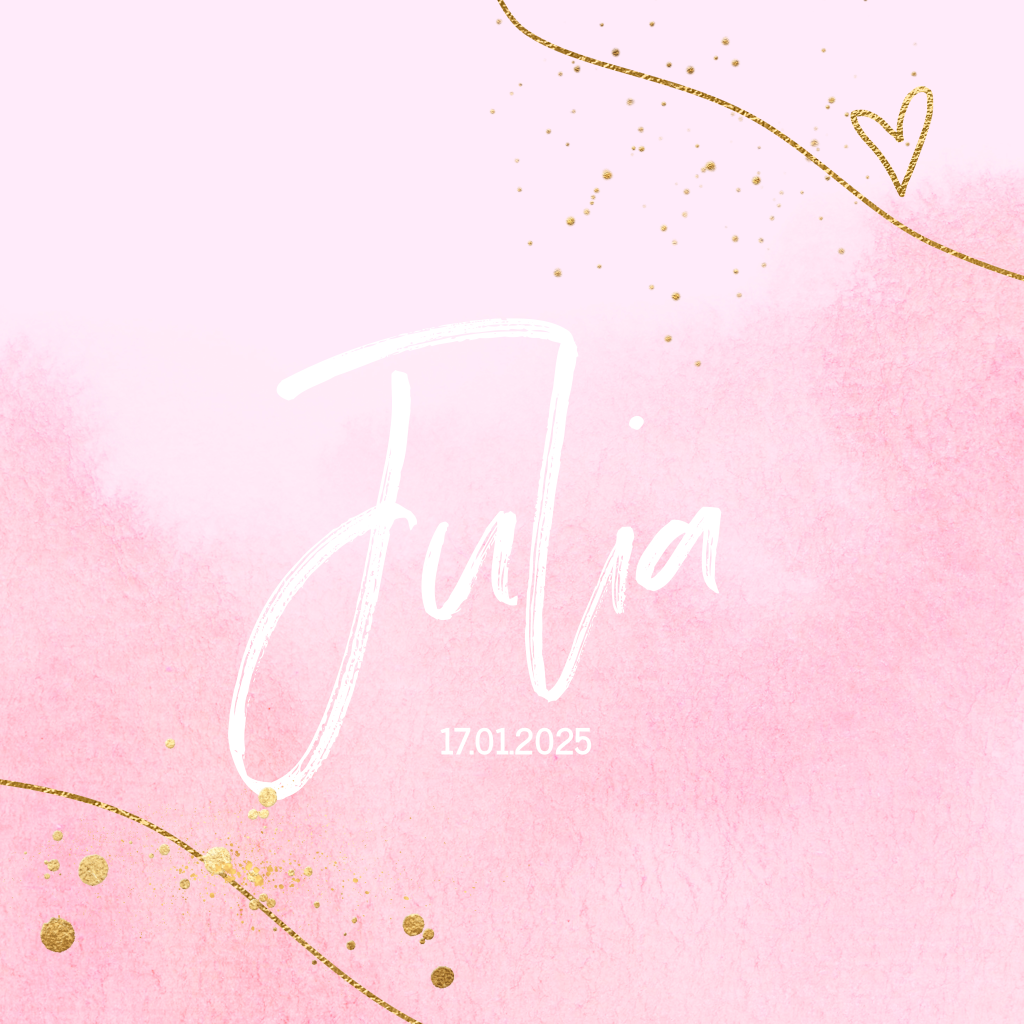 Stoere geboortekaart voor de geboorteaankondiging van je dochtertje met roze watercolour en goudlook details en een lief hartje.