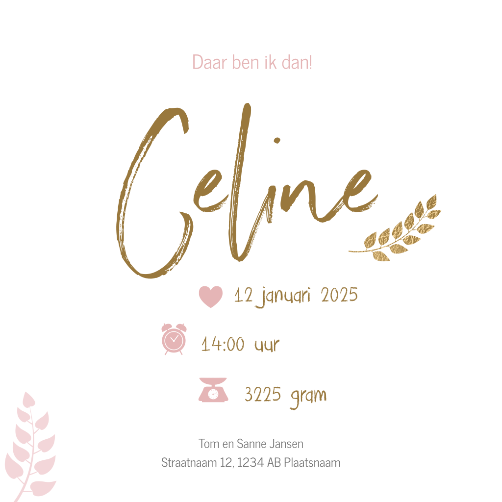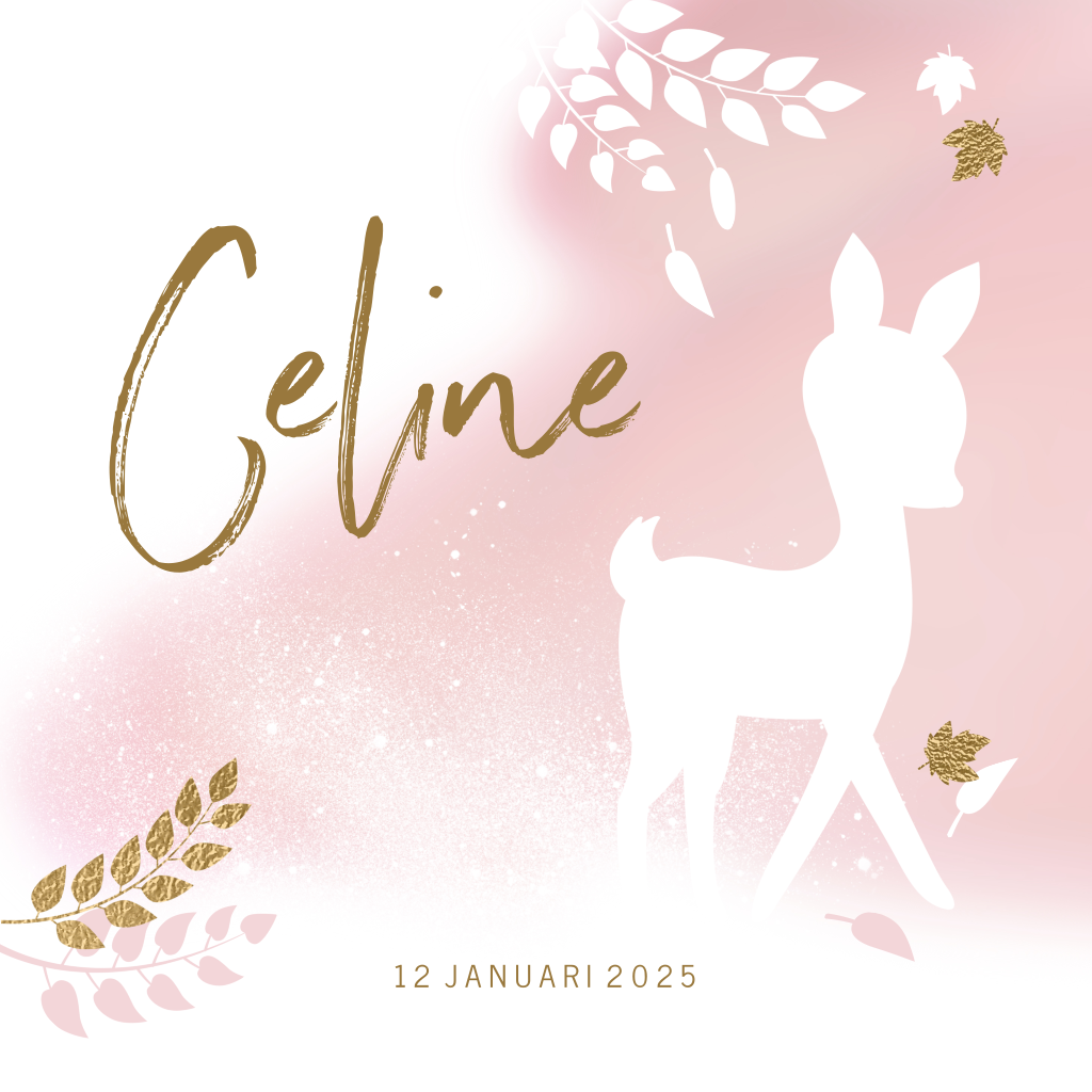 Schattig geboortekaartje voor je dochtertje die in de herfst geboren wordt. Met een lief silhouet van een hert op oudroze waterverf en goudlook takjes en bladeren.