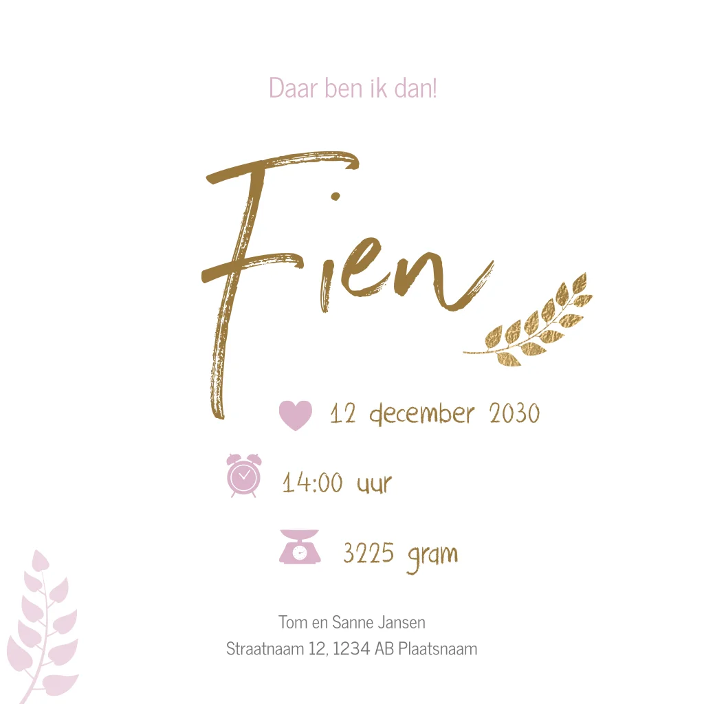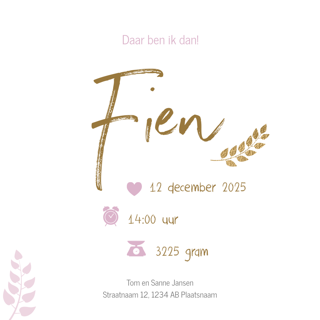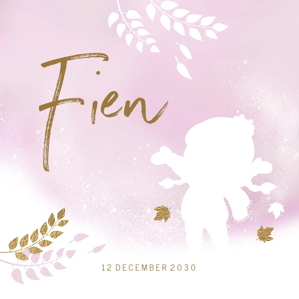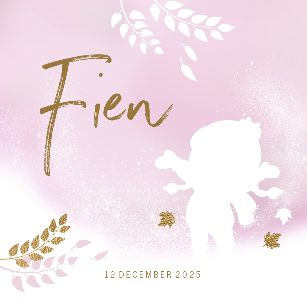 Winters geboortekaartje voor de geboorte van je dochtertje met hip silhouet van een meisje die in de sneeuw aan het spelen is. De roze waterverf achtergrond en goudlook takjes maken dit echt een vrolijk geboortekaartje!