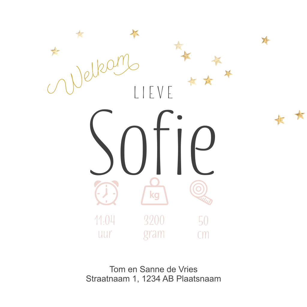 Lief geboortekaartje voor een meisje van een ooievaar op een wolk met sterretjes in goudlook en glitter. Lettertypes en kleuren zijn eenvoudig zelf aan te passen in onze online editor. Bestel een eerste proefdruk voor slechts 1€!