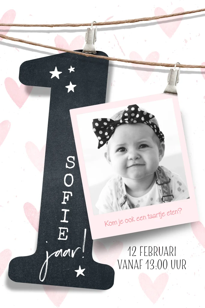 Wat een hippe uitnodigingskaart met een krijtbord-1 en een tof fotoframe aan twee touwtjes! Ook lief is de achtergrond met roze hartjes. Wanneer gaan jullie de 1e verjaardag vieren?