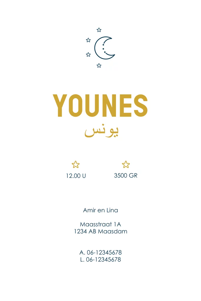 Een stijlvol Arabisch geboortekaartje voor jouw kindje. Het kaartje heeft een donkerblauwe achtergrond met goudfolie details van sterretjes en maantjes. Pas het ontwerp naar wens aan in onze online editor.Dit product maakt onderdeel uit van deze set.