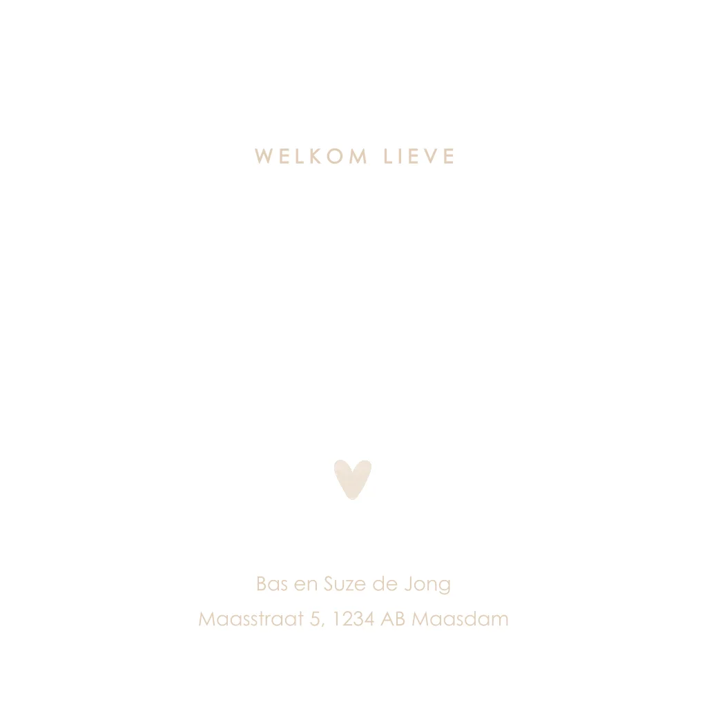 Een stijlvol geboortekaartje voor jouw kindje. Het kaartje heeft een beige velvet-look achtergrond met hartjes. De naam wordt gedrukt in goudfolie.