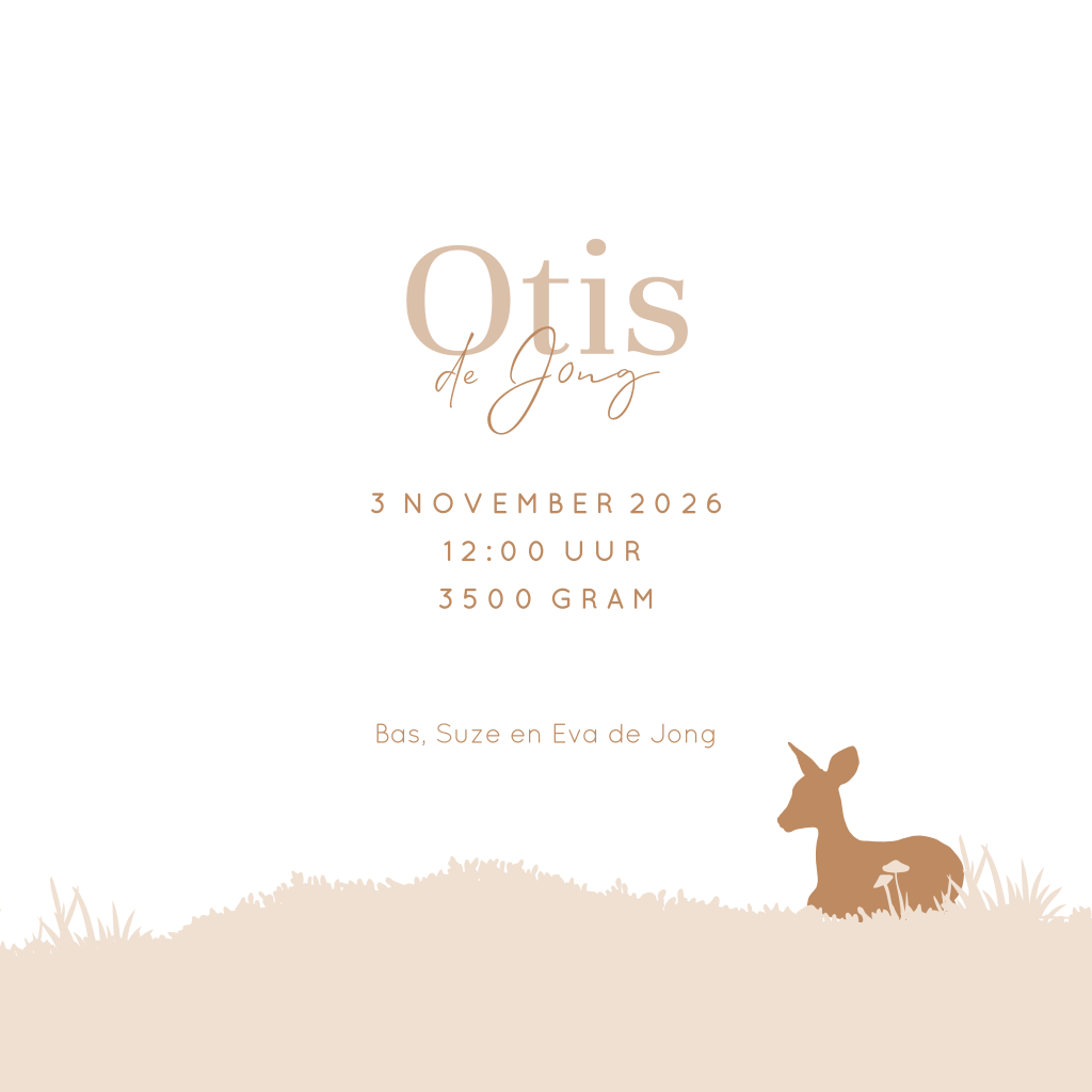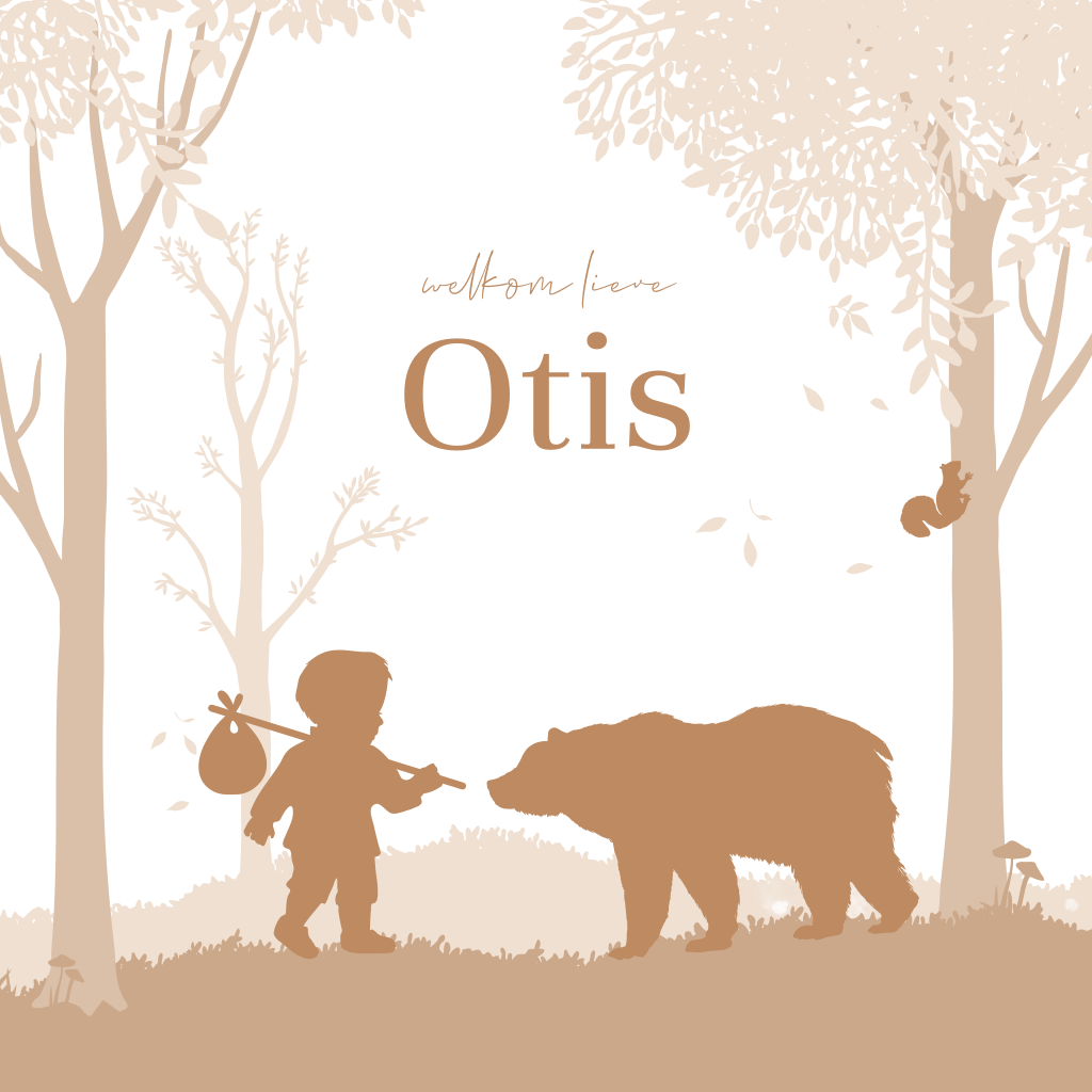 Dit is een mooi geboortekaartje voor jullie zoon. Op het kaartje staan de silhouetjes van een jongen en een beer in een bos. Het kaartje bestaat uit bruintinten waardoor het een neutrale en rustige uitstraling heeft. Het kaartje kan naar wens aangepast worden in onze online editor.