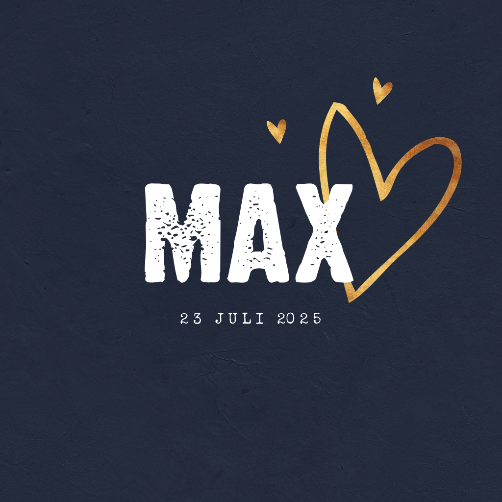 Hip babykaartje voor de geboorte van jullie zoon. Het kaartje heeft een mooie donkerblauwe achtergrond, de naam van jullie zoontje in een stoer lettertype en goudkleurige hartjes.