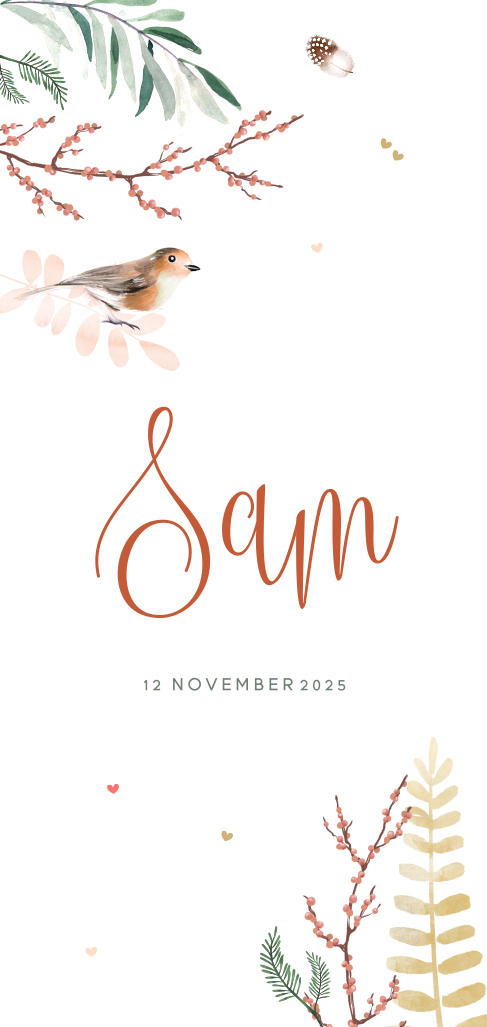 Een enkel kaartje met kleine takjes, een vogeltje en lieve hartjes. Leuk voor een jongen! Tip: komt mooi uit op Oud-Hollands papier met bijvoorbeeld een olijfgroene envelop.