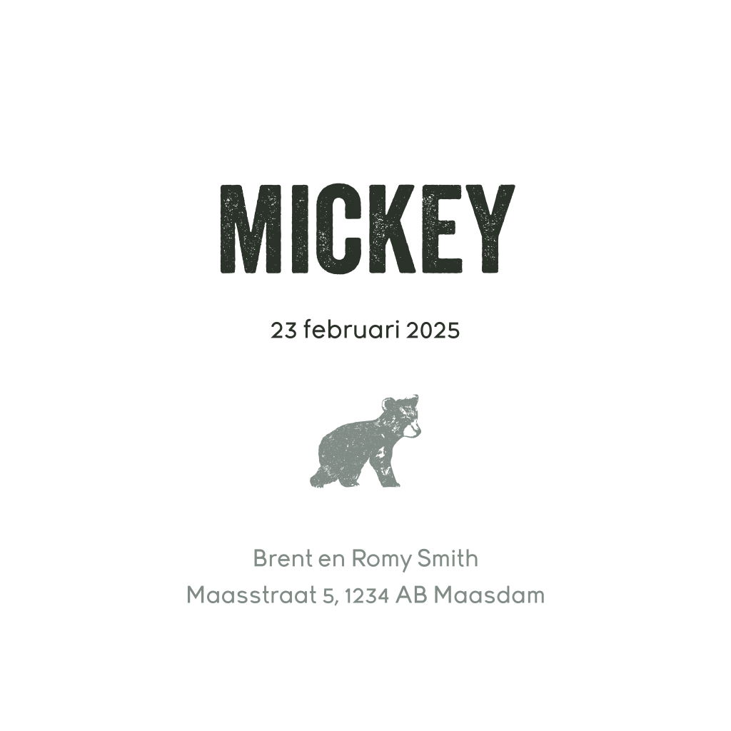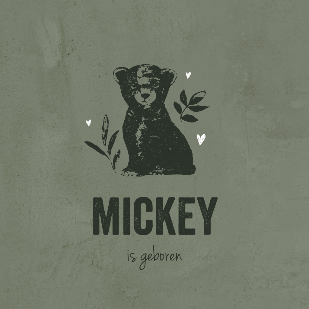 Kondig de geboorte van jullie zoon aan met dit stoere kaartje! Het kaartje heeft een groene velvet-look achtergrond. Centraal op het kaartje staat de illustratie van een beer met drie kleine witte hartjes. Pas het kaartje naar wens aan in onze online editor en bestel snel een proefdruk om dit kaartje in het echt te zien!