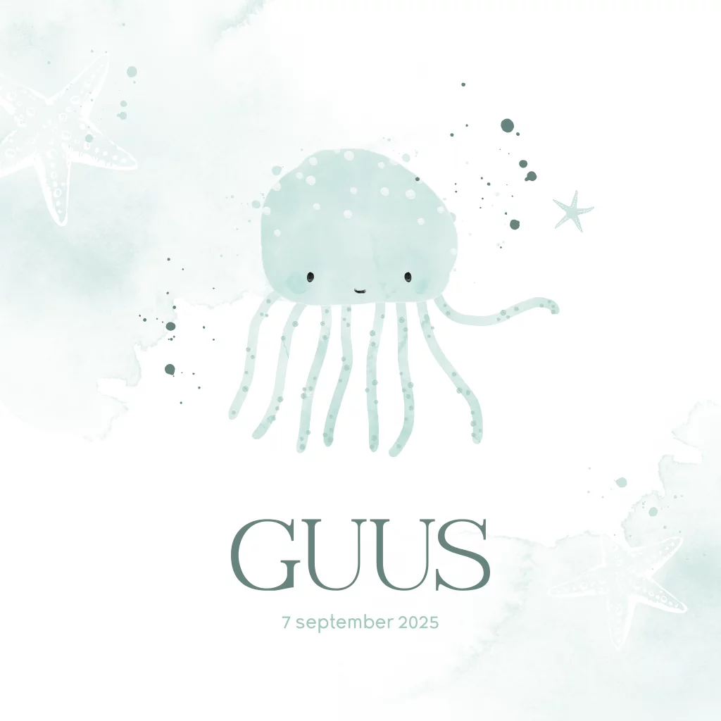 Hippe geboortekaart voor de geboorte van je zoontje met aquarel illustratie van schattig kwalletje.