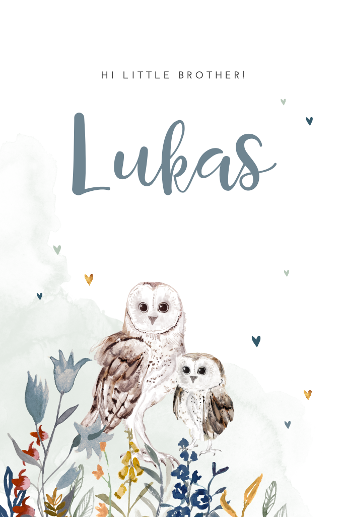 Lieve geboortekaart voor je zoontje met een gave waterverf illustratie van twee uilen broertjes. Verander de achtergrondkleur en kies een ander lettertype om dit geboortekaartje af te maken.