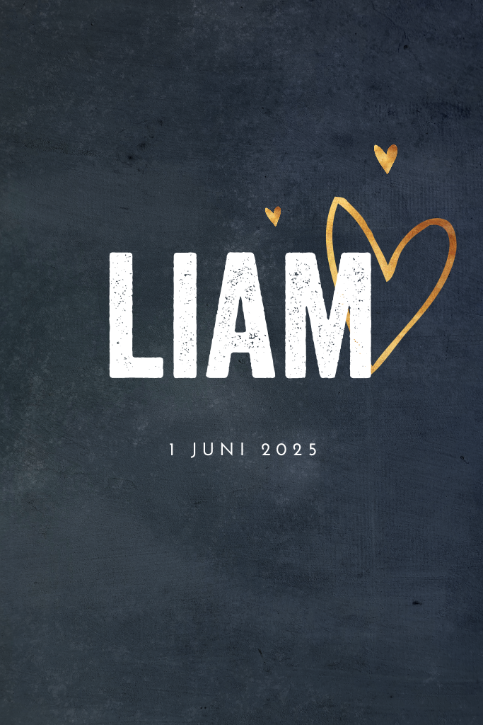 Stijlvol geboortekaartje voor je zoontje met een hartje in goudlook op een hippe donkerblauwe achtergrond.