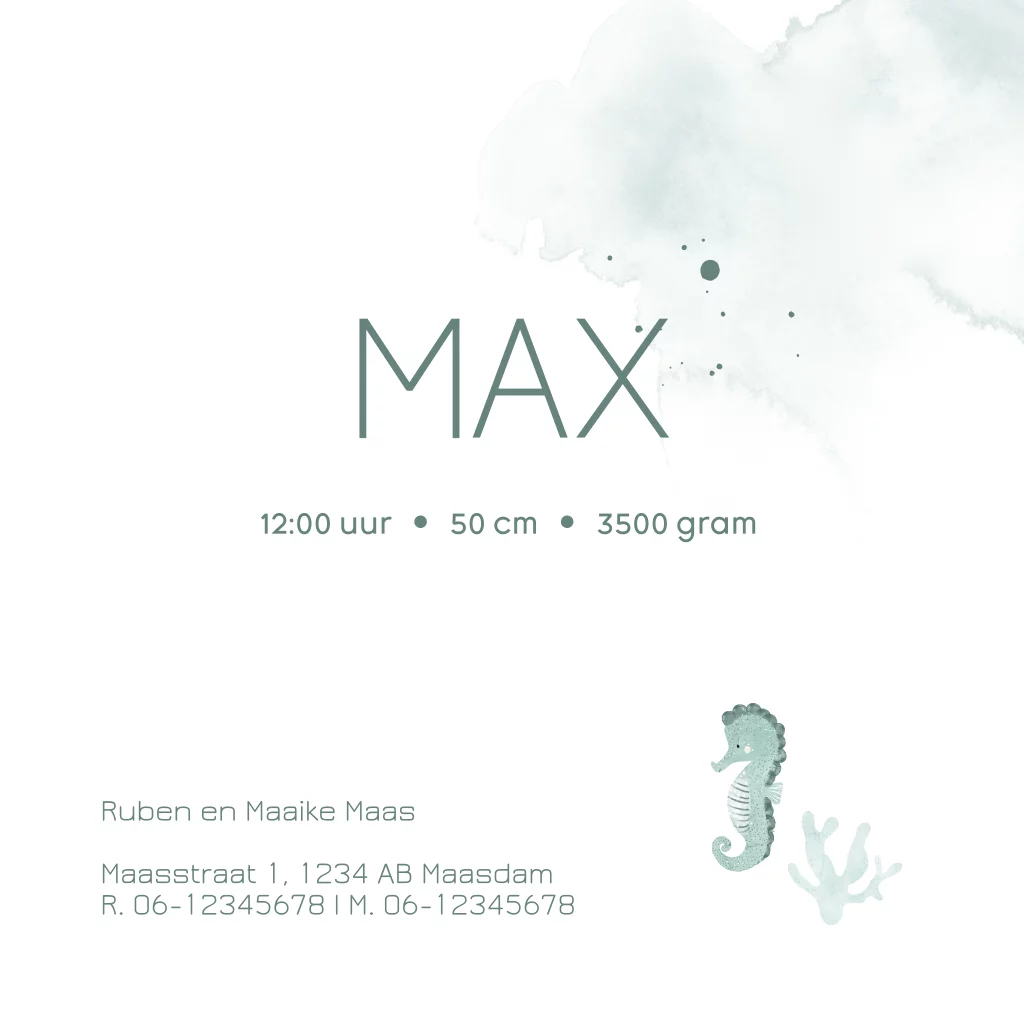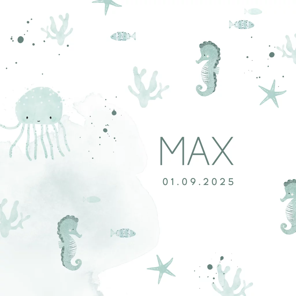 Origineel geboortekaartje voor je pasgeboren zoon met vrolijke illustraties van zeedieren met zeegroene waterverf zoals een kwal, zeewier en zeepaardjes.