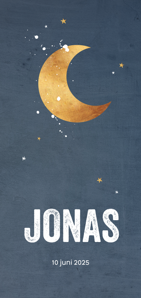 Hip geboortekaartje voor de geboorte van je zoon met een grote maan in goudlook op een donkerblauwe achtergrond. Schrijf een persoonlijke tekst en maak dit geboortekaartje af!