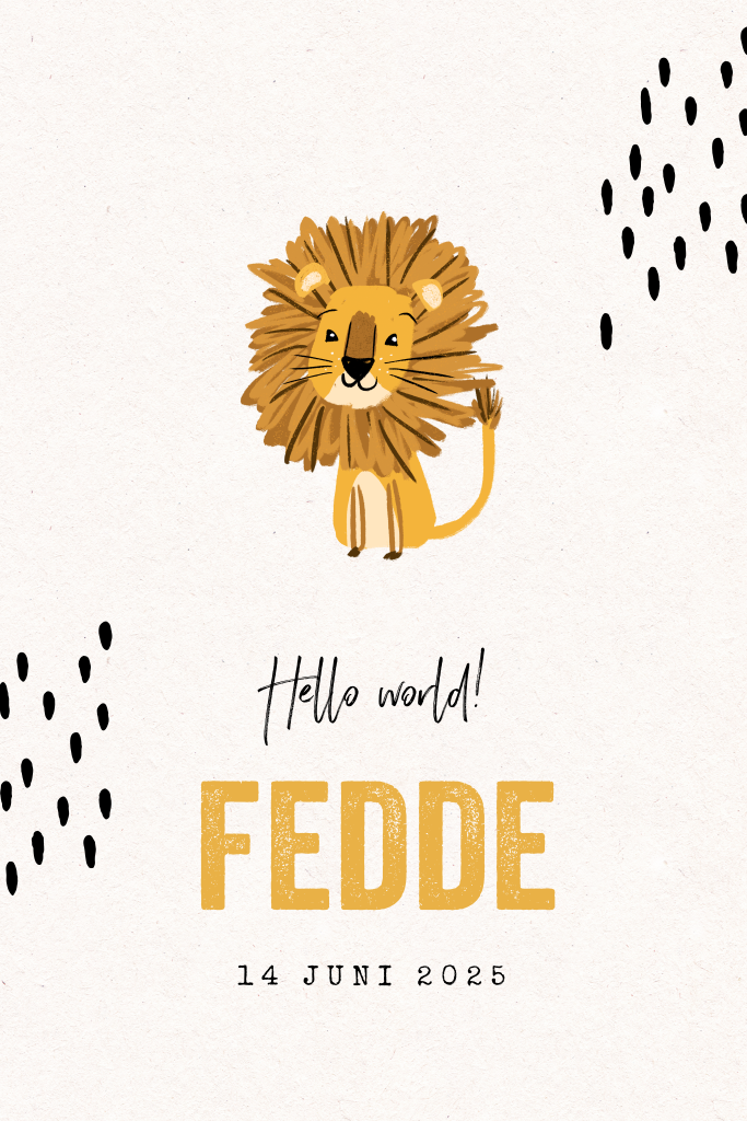 Trendy geboortekaartje voor je pasgeboren zoon met een hippe illustratie van een leeuwtje op een achtergrond met de look van karton.