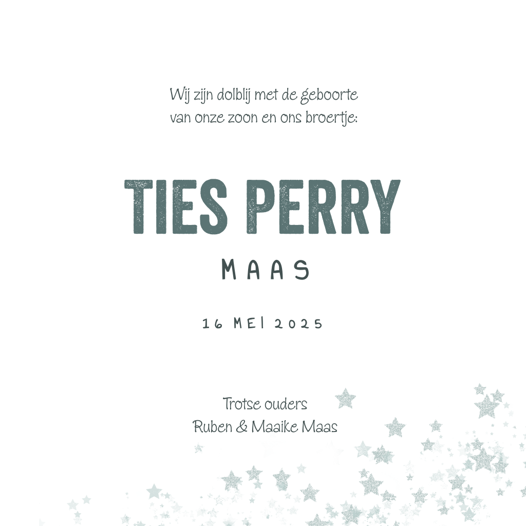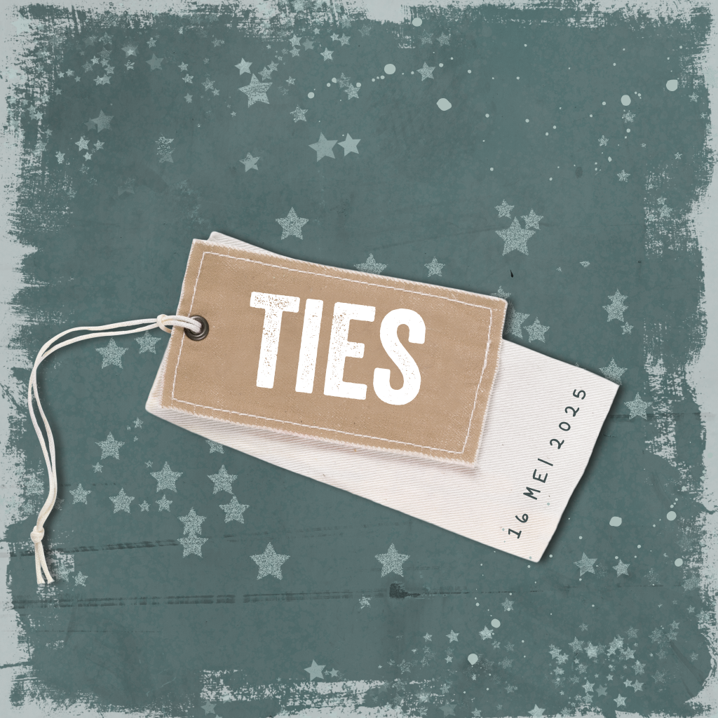 Stoere geboortekaartje voor je zoontje met een hippe geverfde achtergrond met sterretjes wat dit kaartje een vintage-look geeft. Zet de naam van je zoon op het label en bestel een proefdruk om hem in het echt te bekijken!