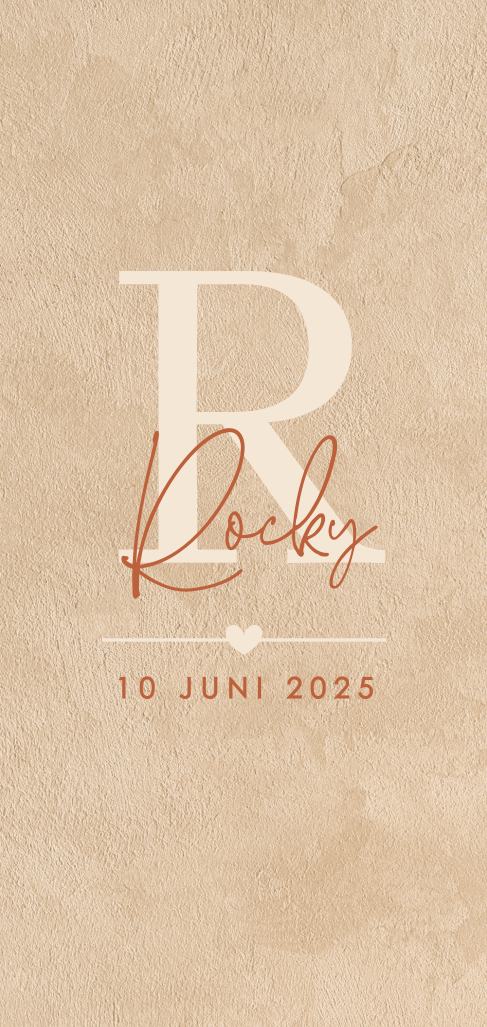 Dit is een stoer kaartje voor jullie pasgeboren kindje. Het kaartje heeft een bruine velvet-look achtergrond en vergoot het bijpassende initiaal van de naam van jullie kindje. Pas het kaartje naar wens aan in onze online editor en bestel snel een proefdruk om dit kaartje in het echt te zien!